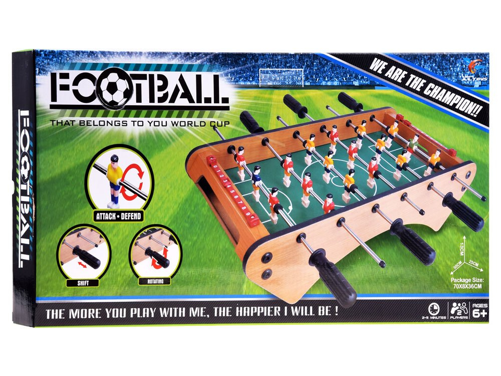Známá hra stolní fotbal na dřevěném stole v klasické verzi v miniaturním provedení. Skutečný fotbalový turnaj u vás doma. Během zápasu se postará o spoustu vzrušení. dva týmy s devíti hráči v každém vzbudí v každém fotbalovém fanouškovi značné vzrušení.
