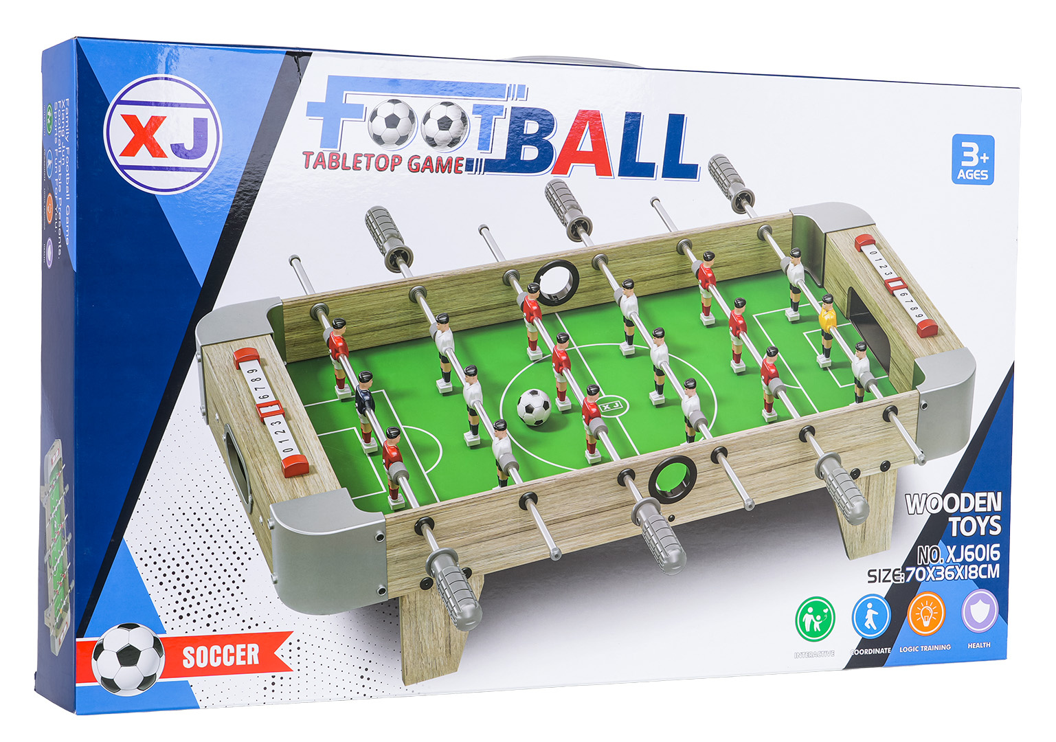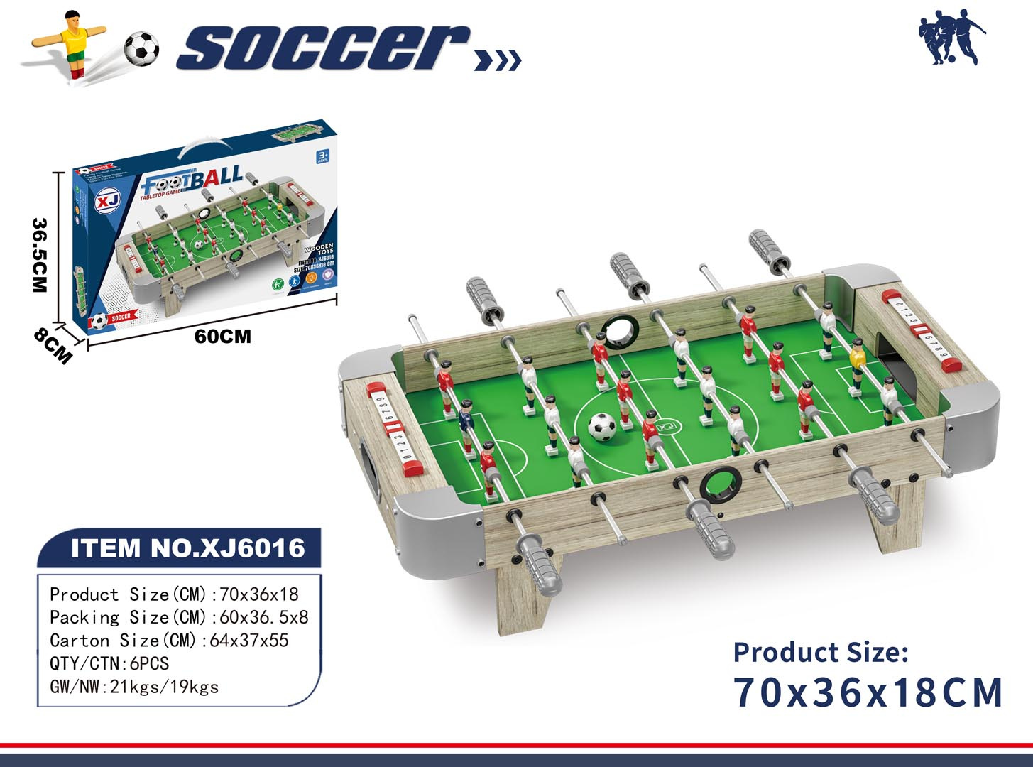 | Rozměry | - stůl na stolní fotbal cca. 70 cm x 36 cm x 18 cm, - průměr míče cca.3 cm, - fotbaloví hráči přibližně. 7,5 cm x 2,5 cm, - opakování cca 60 cm x 8 cm x 37 cm. |