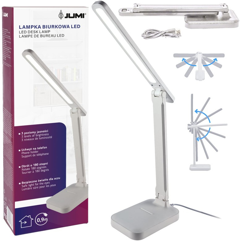 Rozsah nastavení ramene je 180 stupňů, což umožňuje libovolně nastavit směr světla podle vašich potřeb. Světlo má praktický držák na telefon. Lampa má 3 režimy intenzity světla. Intenzitu osvětlení můžete ovládat, což je užitečné zejména při dlouhé práci nebo studiu.