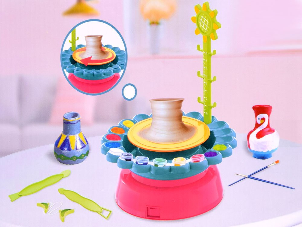 Hrnčířský kruh je skvělým nápadem na dárek pro děti, které rády tráví čas kreativním způsobem. Hračka je ideální pro každého, kdo má rád manuální práci a nebojí se trochu ušpinit. S tímto úžasným strojem lze z hlíny vykouzlit zajímavé věci (např. vázy, džbány, hrnce, talíře, šálky) a krásně je ozdobit plastovými noži a štětci a barvami. Ochranná zástěra je navržena tak, aby se malý umělec příliš neušpinil.