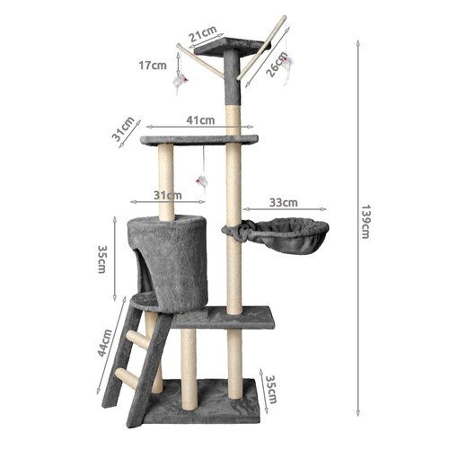 Podlahy škrabadla pro kočky jsou lemovány extrémně jemnou kožešinou, která zaručuje pohodlný odpočinek s vrněním v pozadí . Hlavní předností stromu je útulný domeček, ke kterému vedou dva schody. Další možností odpočinku je pelíšek na 3. úrovni škrabadla. Kotě bude moci volně odpočívat. 3 úrovně pozorování uspokojí kočičí zvědavost. Pro případ nudy můžete také lovit 3 myši upevněné na gumičkách , které jsou umístěny ve 4. a 5. patře škrabadla - můžete je chytit a napadnout.