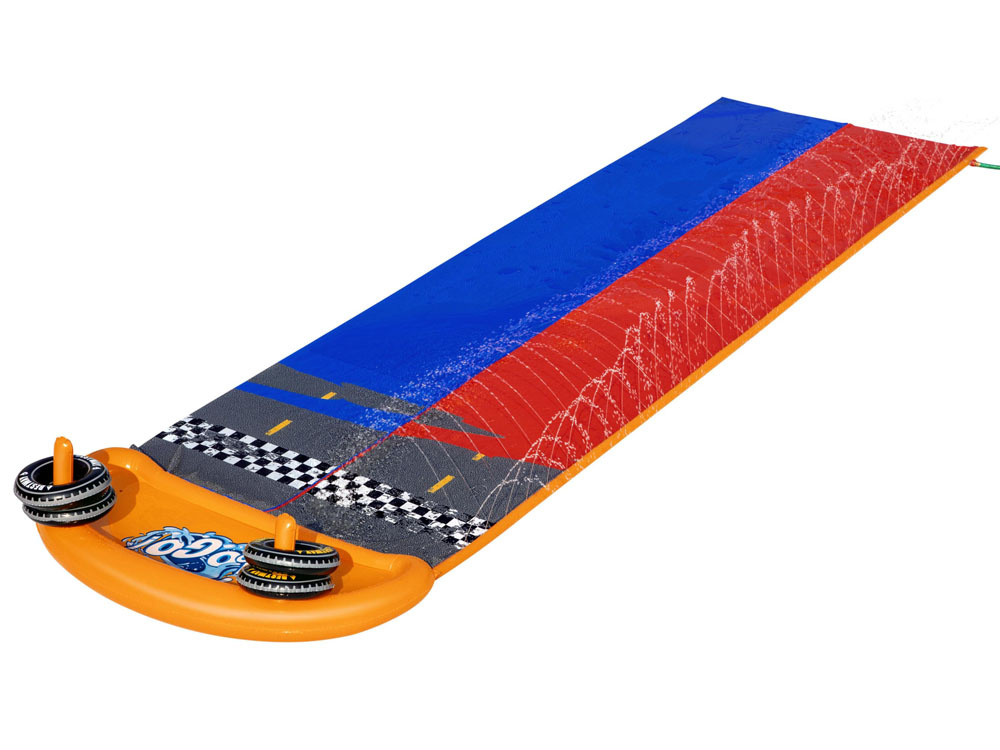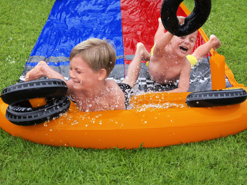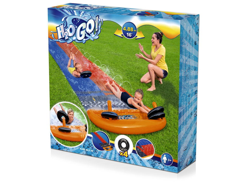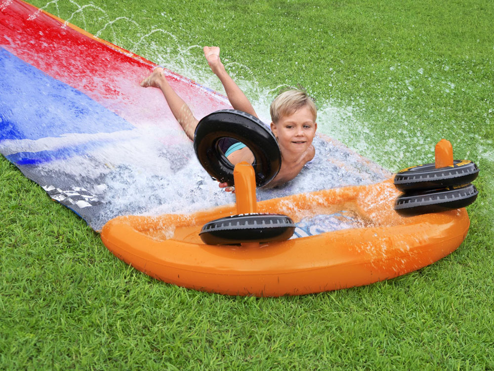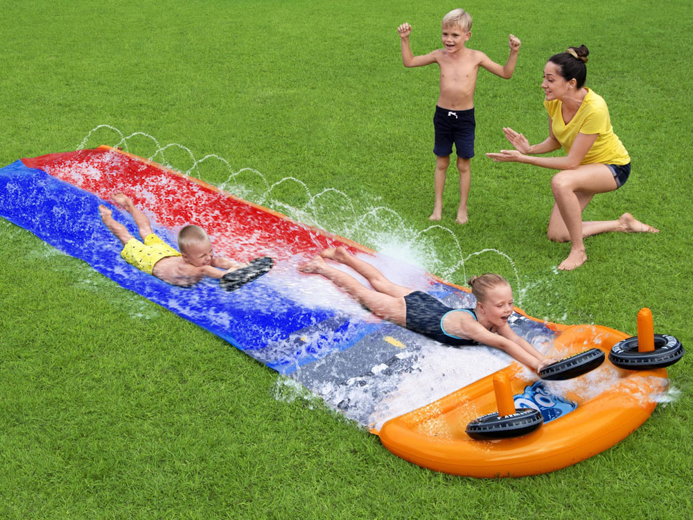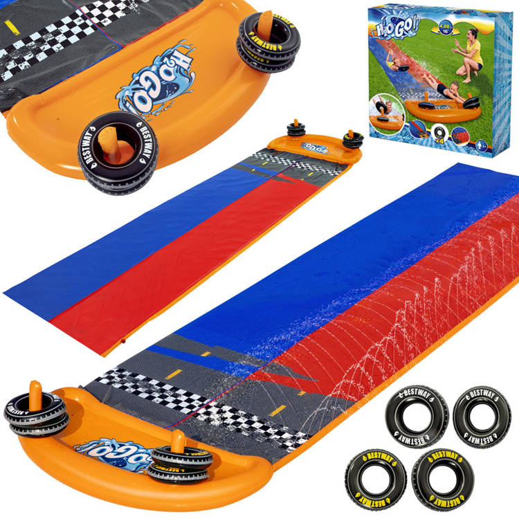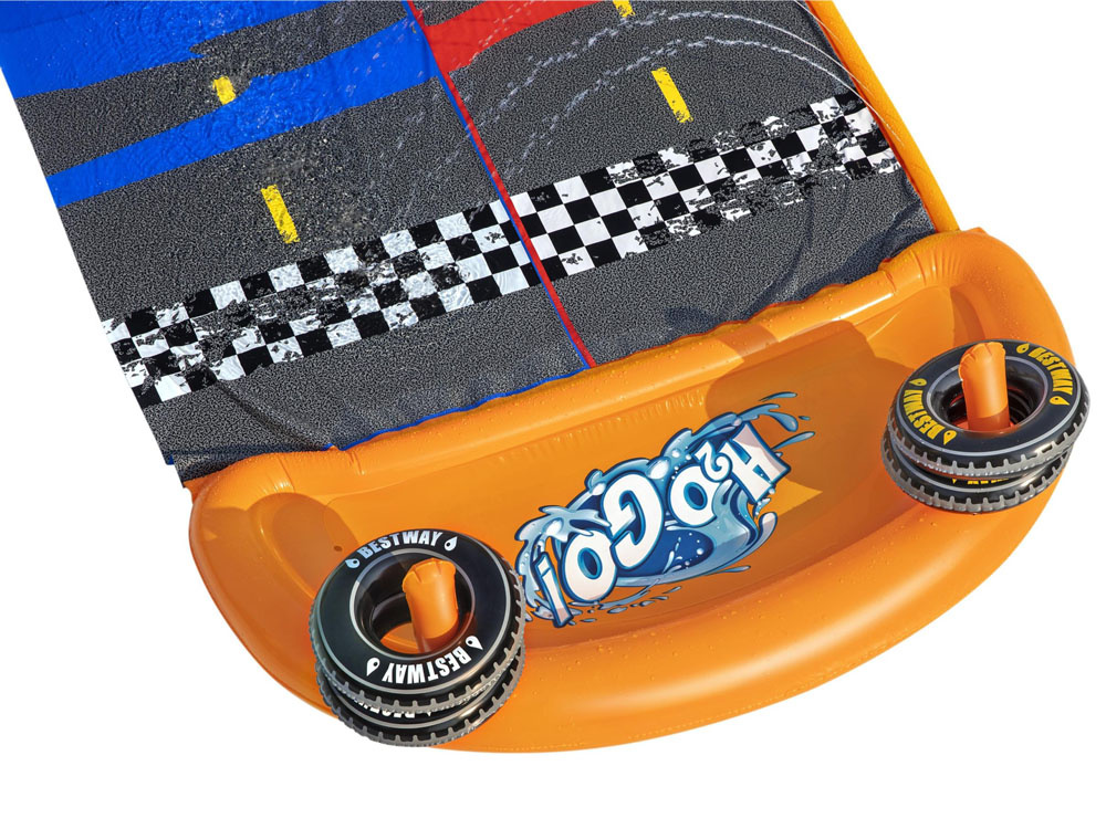 Dvojitý skluz H2O GO!s cílovou čárou se zabudovanými nafukovacími kužely a dalšími 4 nafukovacími koly pro pořádání závodů je další nabídkou společnosti Bestway pro letošní léto. Určeno pro všechny děti, které si rády hrají venku a neví, co je to nuda! Stačí skluzavku rozložit a uspořádat zábavný závod, jehož vítězem se stane ten, kdo postaví kolečka na kůl jako první! Neuvěřitelná zábava zaručena!