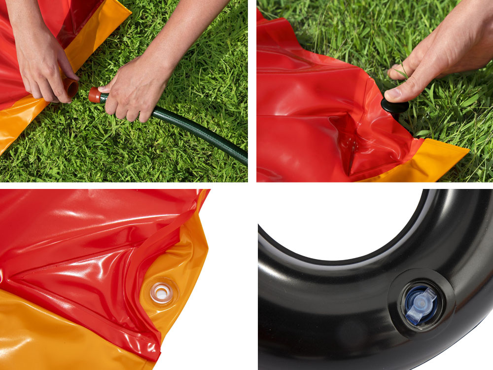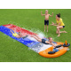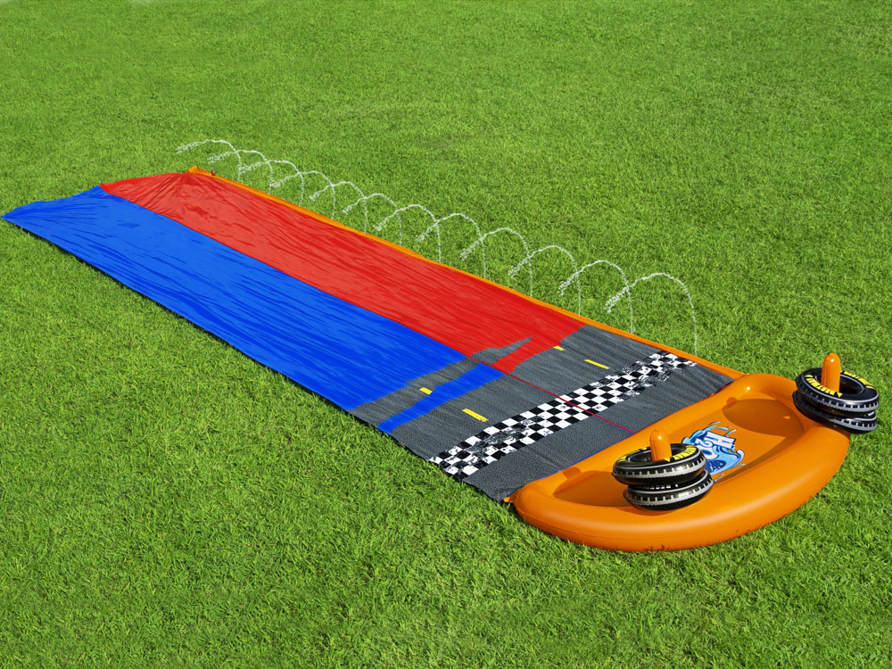 Skluzavka má 488 cm dlouhou dvojitou dráhu a je zavlažována postřikovači umístěnými po celé délce, což zajistí maximální skluz a dodatečné ochlazení v horkých dnech.Vodní sprchy zabudované do skluzavky fungují tak, že se zahradní hadice připojí ke speciálním hákům. Voda se shromažďuje na konci nafukovacího konce a zajišťuje měkké brzdění s velkým šplouchnutím!Díky nejmodernějšímu designu a odolnému, testovanému materiálu použitému na skluznici se bude snadno a bezproblémově používat.