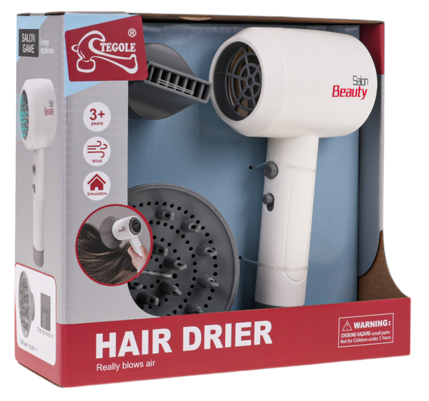 Hračka je vybavena dvěma vyměnitelnými tryskami – difuzérem a zaostřovací tryskou – které ještě více zvyšují zábavu. Díky dvoustupňové regulaci vzduchu mohou děti ovládat provoz fénu, což zajišťuje naprosté bezpečí a pohodlí.
