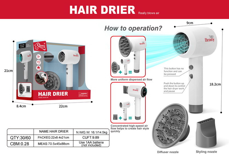 Realistický vzhled a zvuky fénu připomenou dětem zařízení, které používají rodiče a sourozenci. Hračka je vyrobena z nejkvalitnějších materiálů a napájena pouze jednou baterií AA (není součástí balení), což zajišťuje odolnost a bezpečnost při používání. Proudění vzduchu, které při pokojové teplotě vydává poryv větru , bude také příjemné .
