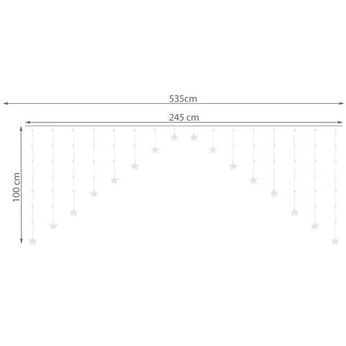 SPECIFIKACE -počet režimů: 8; typ osvětlení; VEDENÝ; barva světla: teplá bílá; barva vedení: transparentní; počet LED: 136; třída vodotěsnosti: IP44; dálkové ovládání: ano; napájení: elektrická síť; výkon: 1,2W; rozměry jedné hvězdy: 9 cm; celková délka: 535 cm; délka rampouchu: 100 cm; hmotnost: 0,388 kg; hmotnost v balení: 0,494 kg.