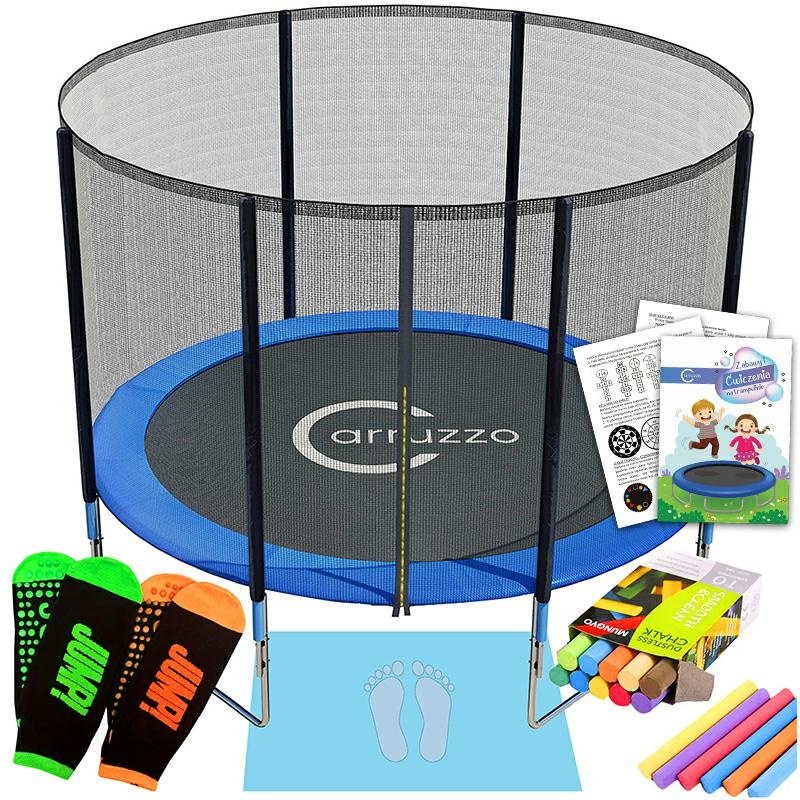 Značka: Carruzzo Technické údaje: - průměr trampolíny: 244 cm - výška ochranné sítě: 156 cm - výška trampolíny: 55 cm - max. zatížení: 150 kg - potah z polypropylenu a tepelně spojeného karbonu - konstrukce z kalené oceli - 42 pozinkovaných pružin napínajících potah - dvouvrstvý kryt na pružiny (PVC + PĚNA) - 3x nožky z kalené oceli v systému U V sadě: - zahradní trampolína - ochranná síť - kryt na pružiny - pěnová podložka (60x25x0,5 cm) - 2 páry protiskluzových ponožek (2 velikosti: S-14 cm, M-16 cm) - barevné křídy - knížka s cvičeními a hrami na trampolíně Označení: - CE - TUV