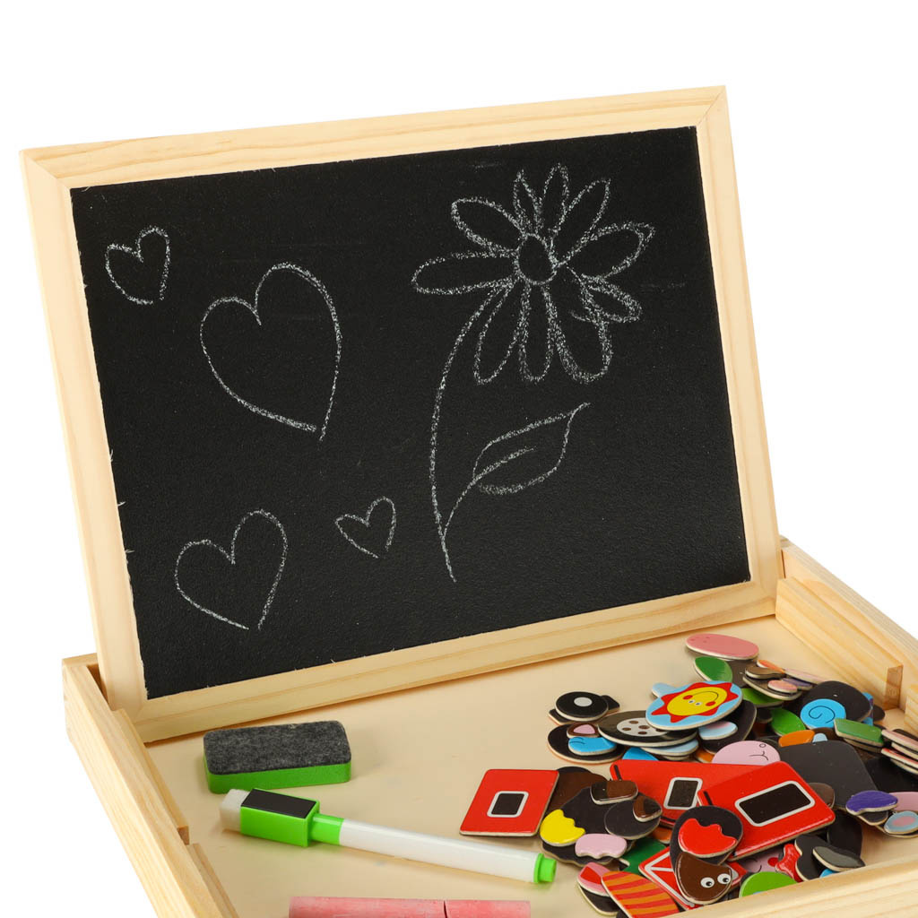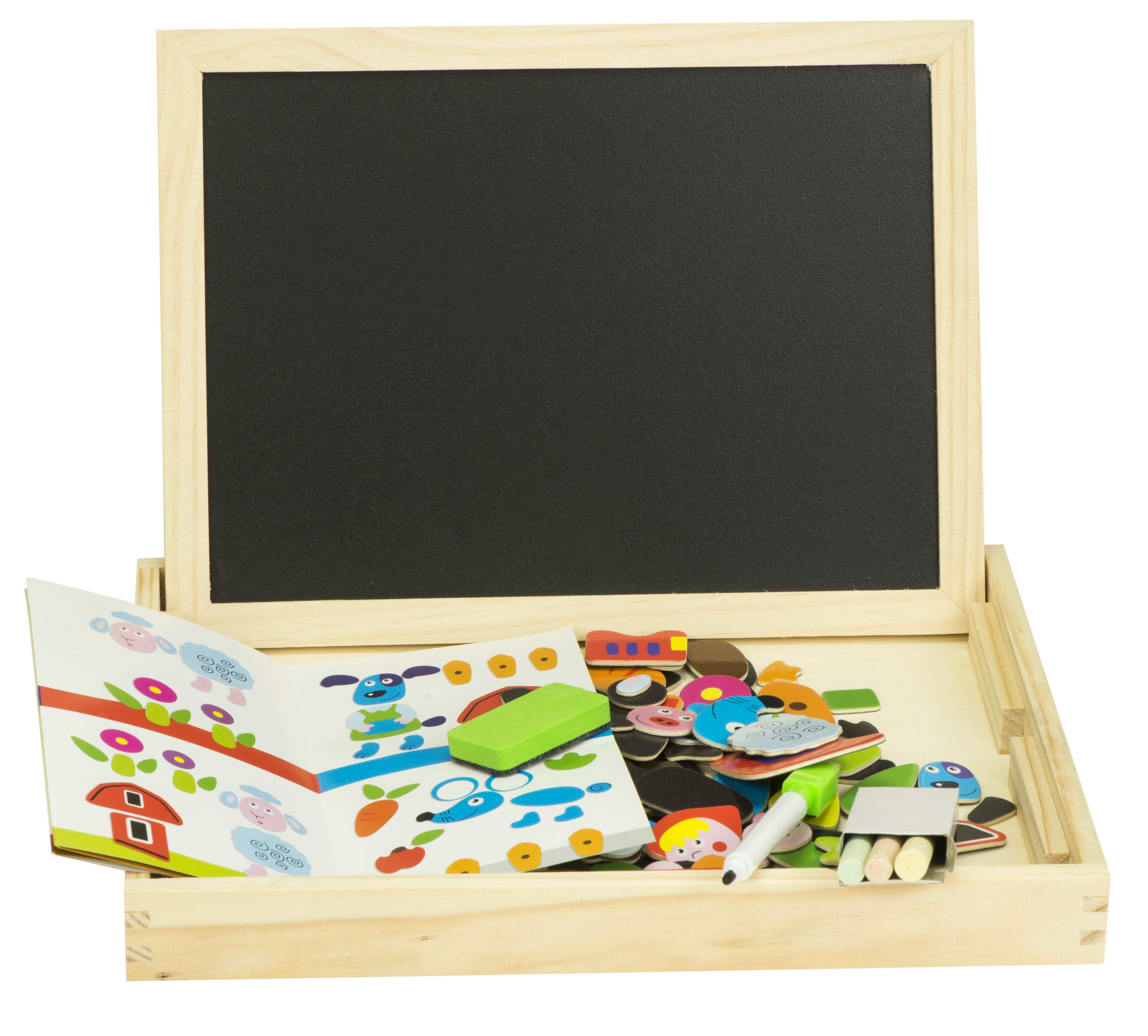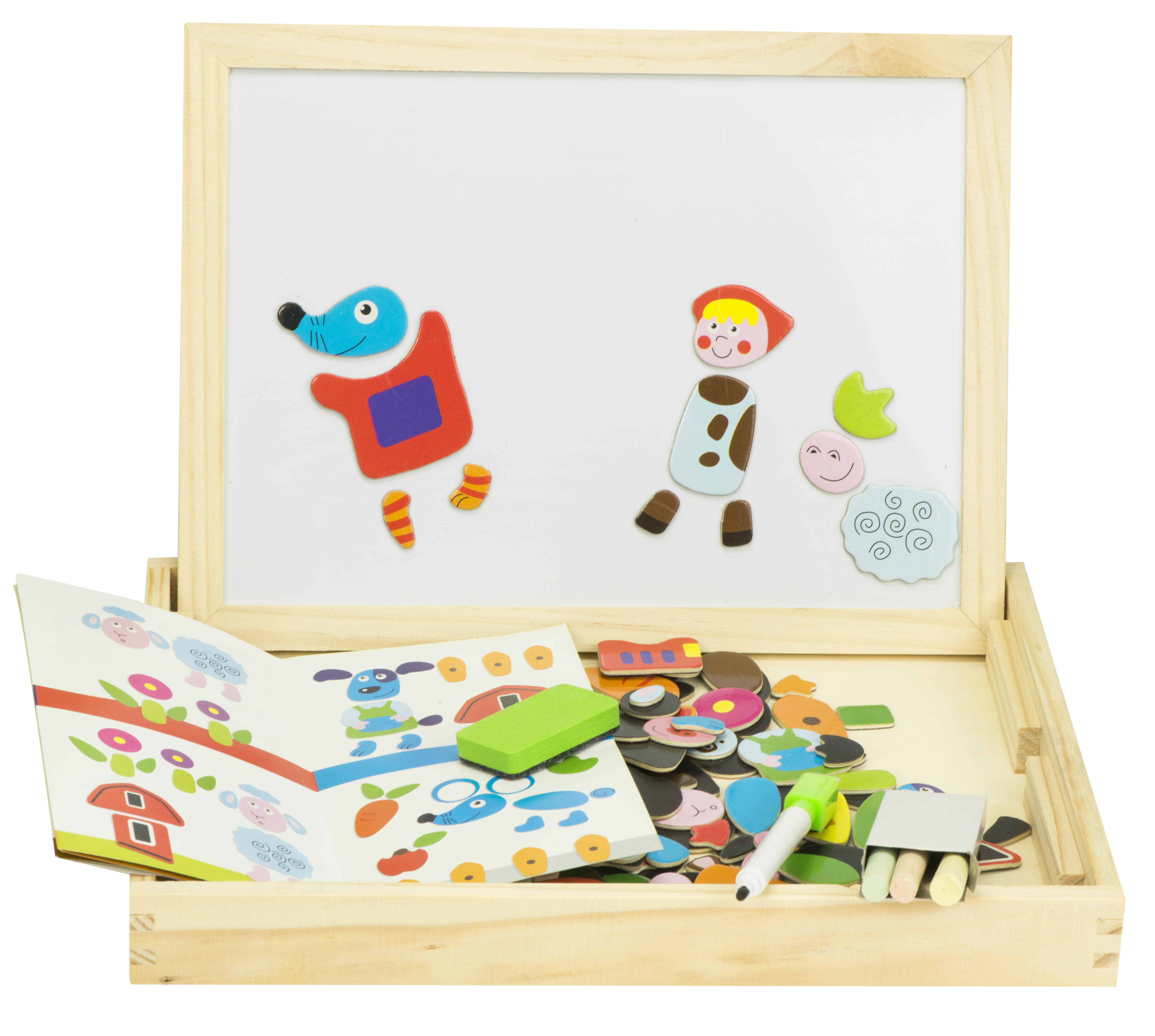 • Oboustranná dřevěná deska s magnetickými skládačkami na uspořádání obrázků.