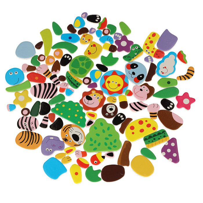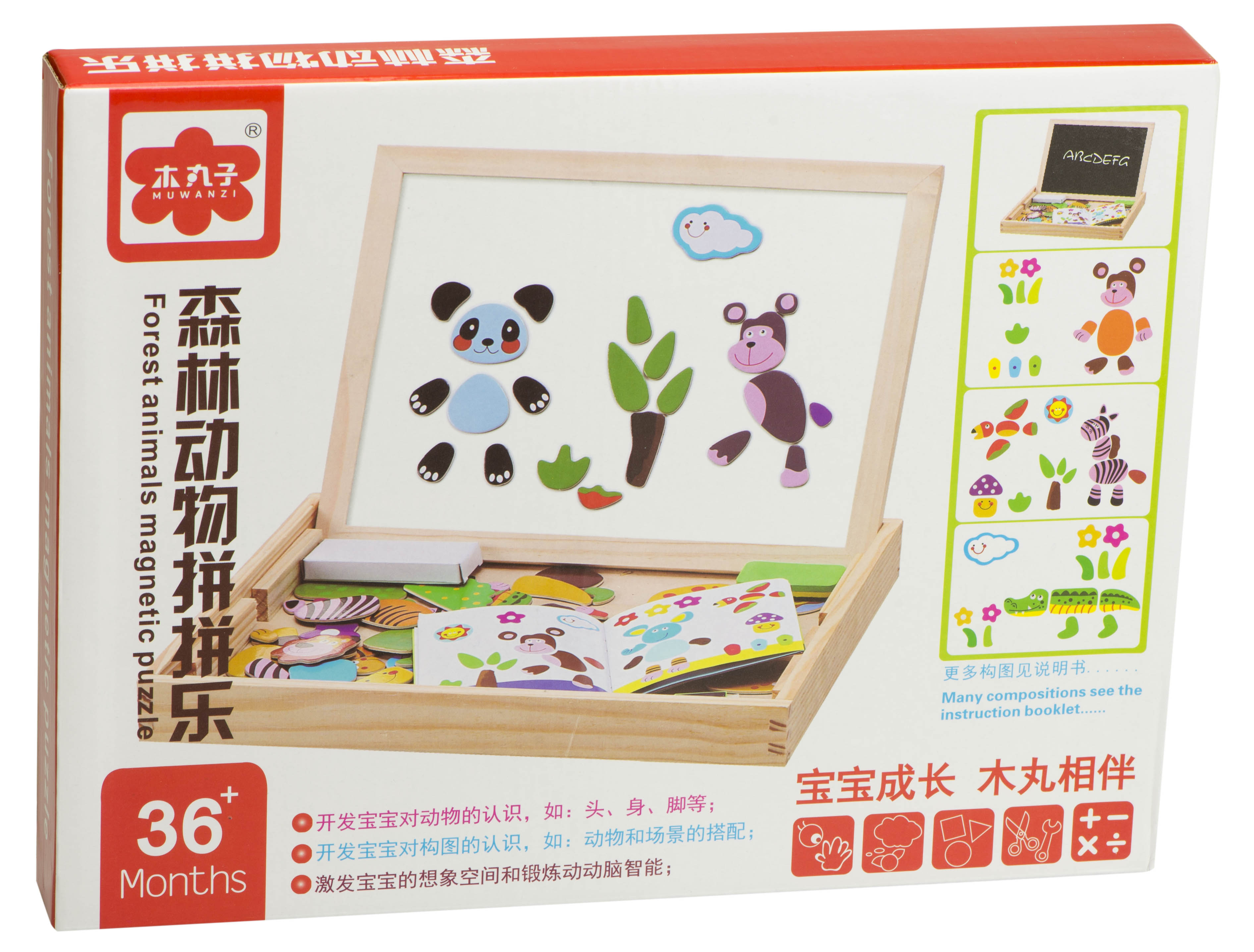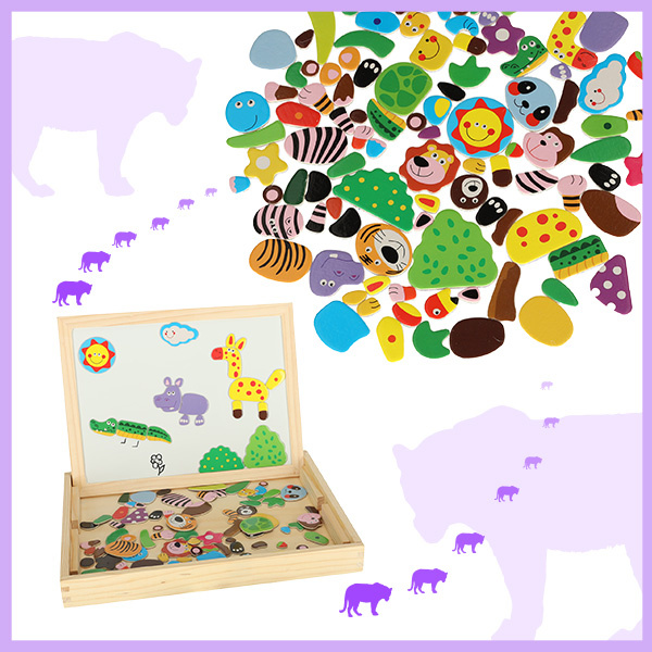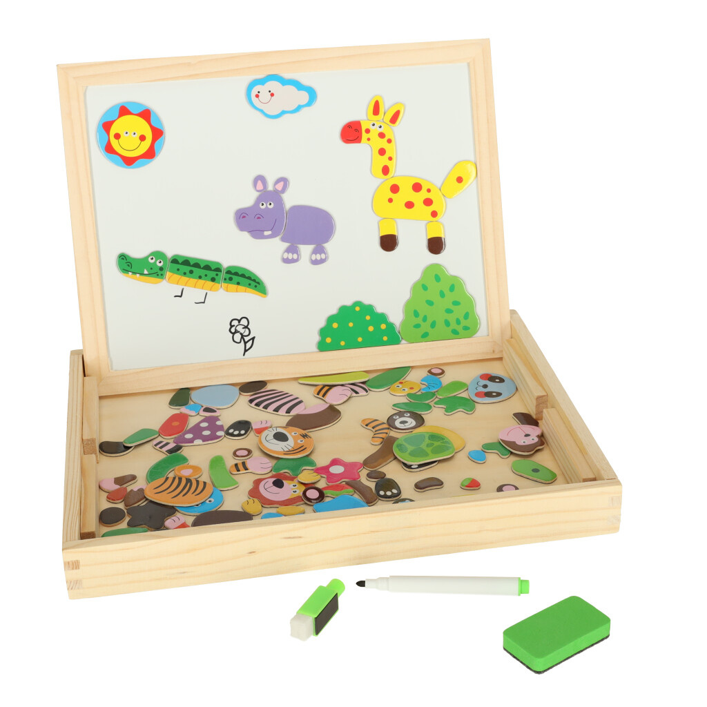 Oboustranná dřevěná deska s magnetickými skládačkami na uspořádání obrázků.