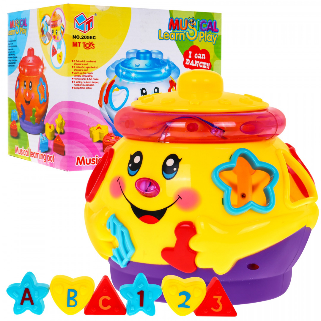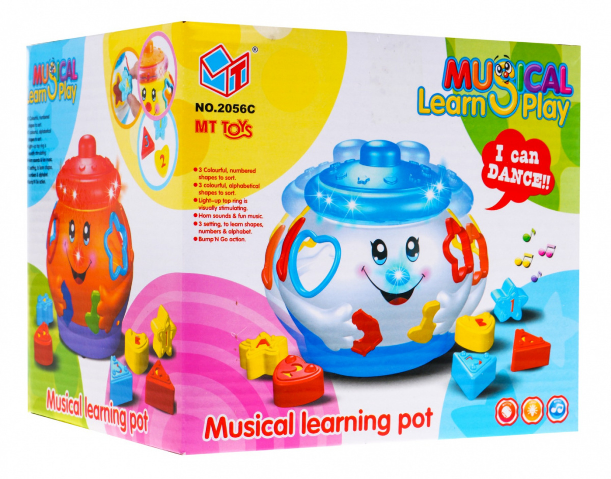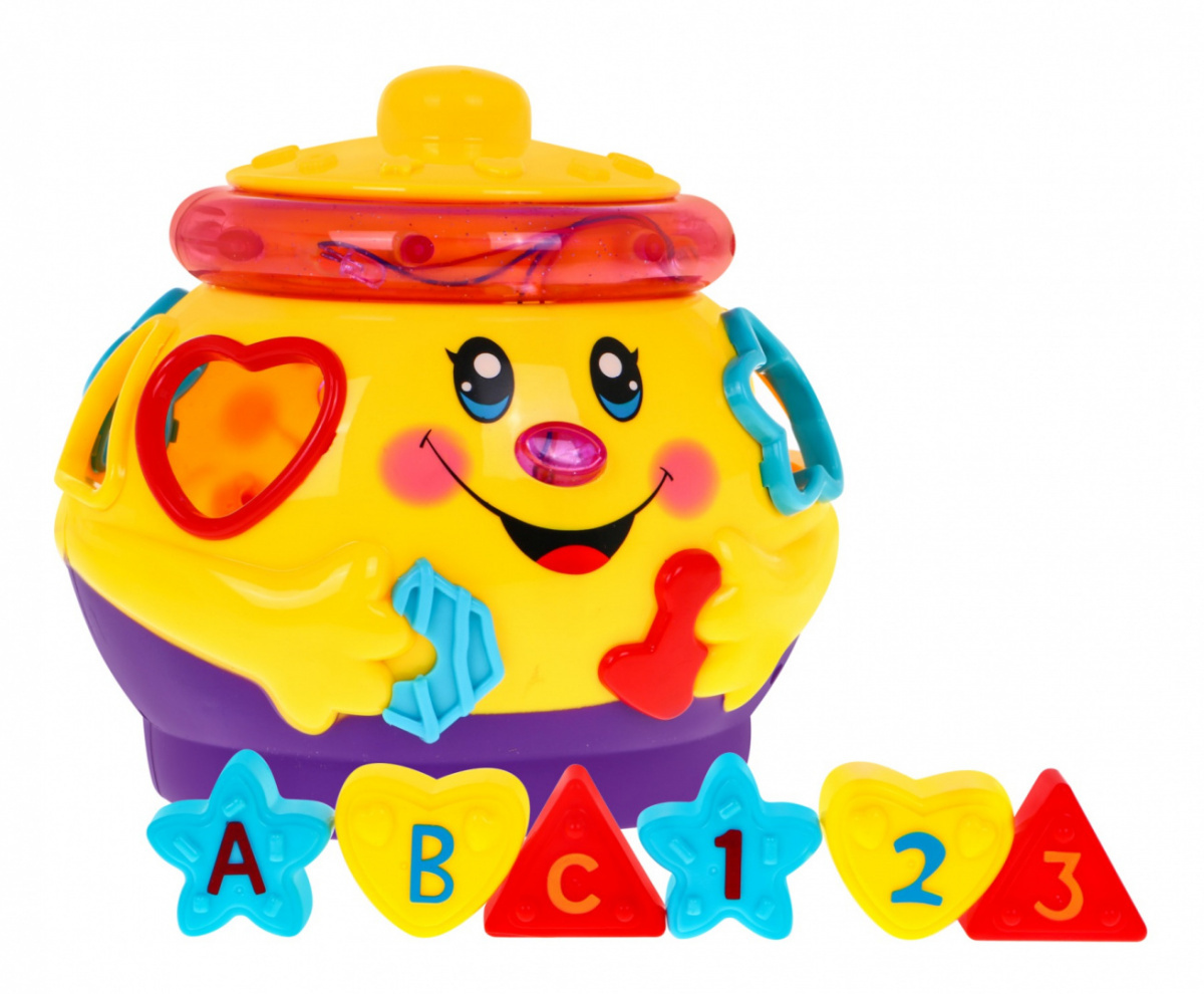Interaktivní hračka pro děti od tří let. Sada se skládá z květináče a šesti různobarevných kostek, jejichž tvary lze přiřadit k otvorům ve stěnách květináče.