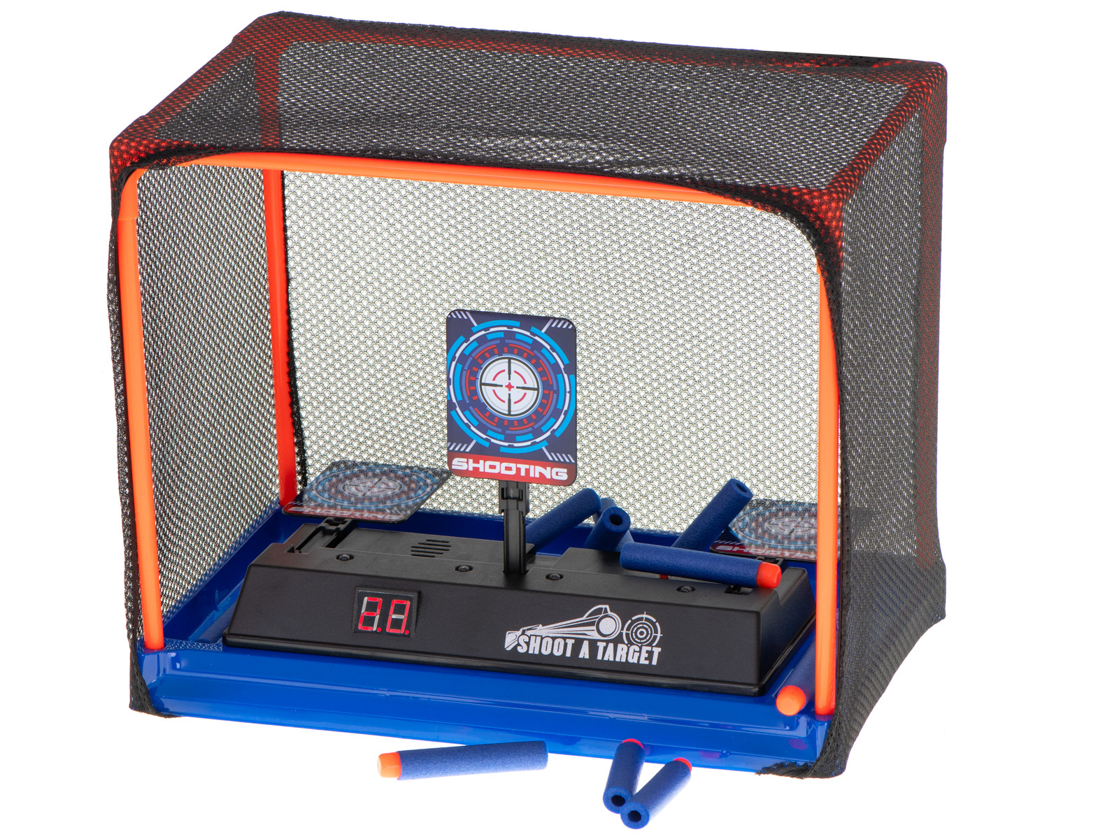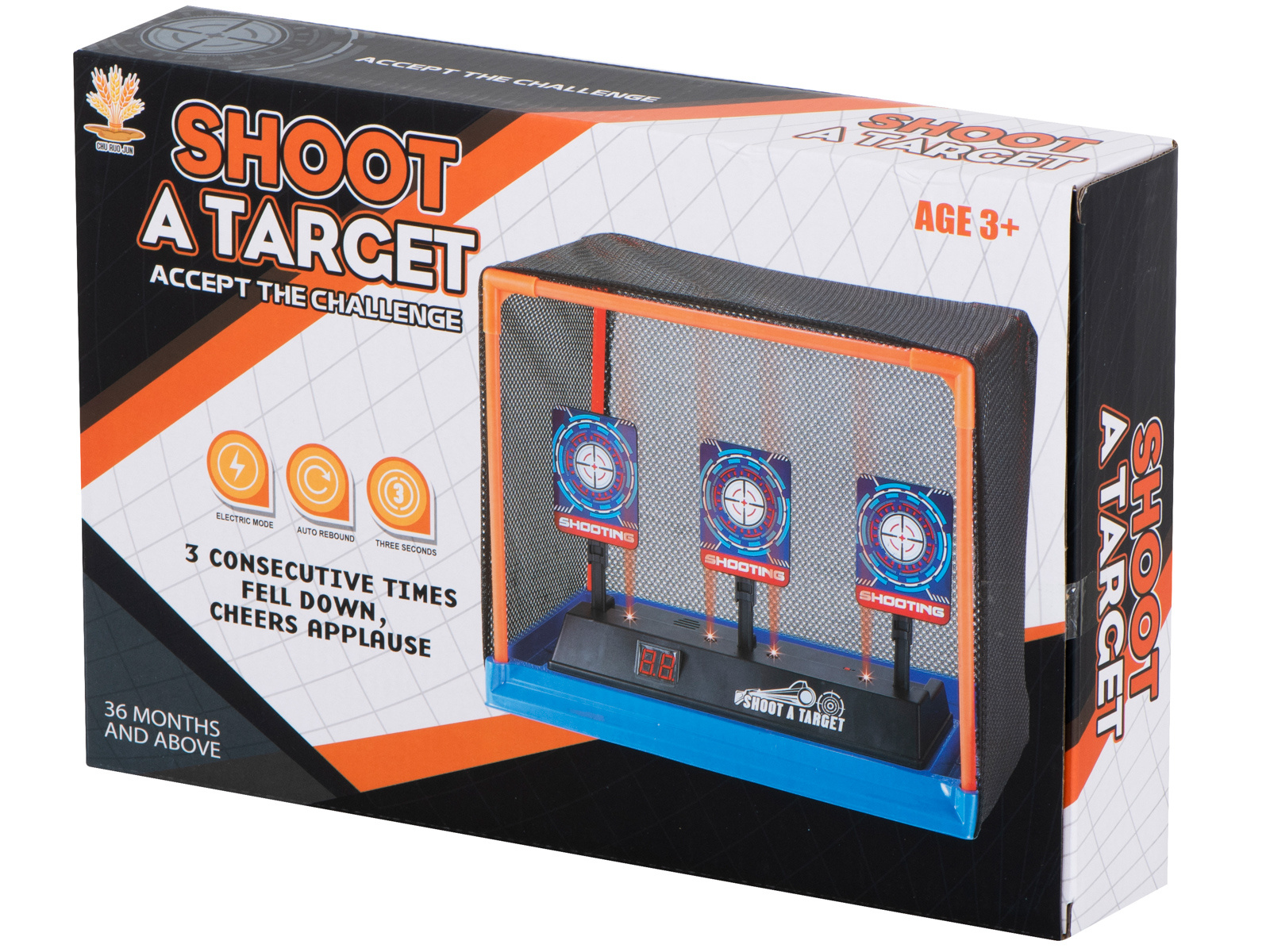 Elektronický střelecký terč s počítadlem bodů. Ideální pro malé nadšence do střelby. Učí přesnosti a soustředění. Součástí dodávky je štít, samomontážní síť. Napájení: 3 baterie 1.5V AA (dodává se). Rozměry. ciferník: 31x20x26cm.Celý popis