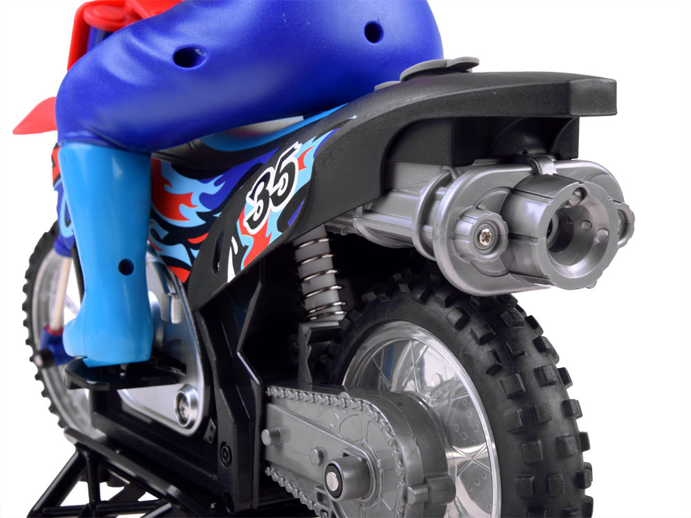 Terénní motorka CROSS s motorkářem na dálkové ovládání pravděpodobně udělá radost každému milovníkovi extrémních sportů. Motorka je vyrobena z plastových dílů, má zadní a přední kola s tlumiči a gumové pneumatiky. Motocykl je velmi pečlivě a esteticky vyroben. Cross má realistické zvuky, ale to není vše. Když se do nádrže během jízdy nalije voda, ve výfukovém potrubí se rozsvítí zelené světlo a začne se z něj kouřit, což zvyšuje realističnost zábavy. Motorka je vybavena opěrkou nohou s kolečky, která umožňuje stabilní jízdu.