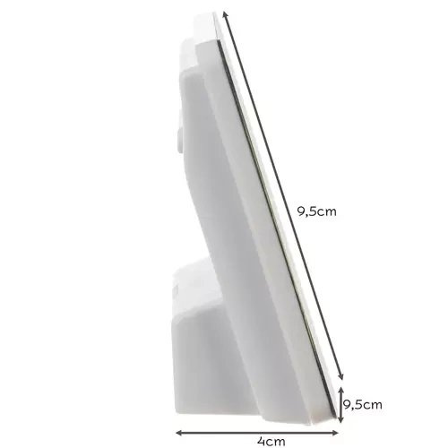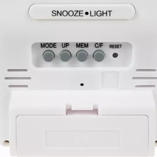 SPECIFIKACE -barva: černá a bílá; materiál: plast / kov; displej: LCD; teplotní rozsah: 0 - 50 stupňů C; rozsah vlhkosti 20-90%; zobrazení teploty na stupnici °C nebo °F; dva formáty na výběr - 12 a 24 hodin; funkce snooze: 8 minut; funkce zobrazení minimální a maximální teploty a vlhkosti: ano; napájení: baterie: 1 x AA baterie (není součástí balení); podsvícení: ano; zvukový signál: ano; rozměry: 9,5 x 9,5 x 4cm; hmotnost: 0,10 kg; hmotnost v balení: 0,15 kg.