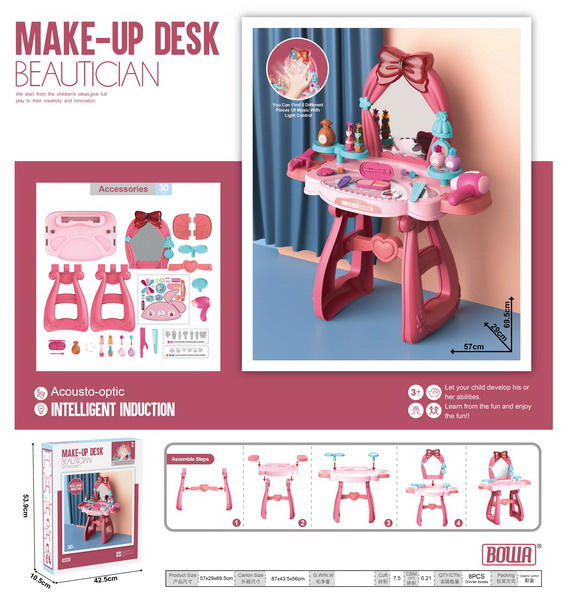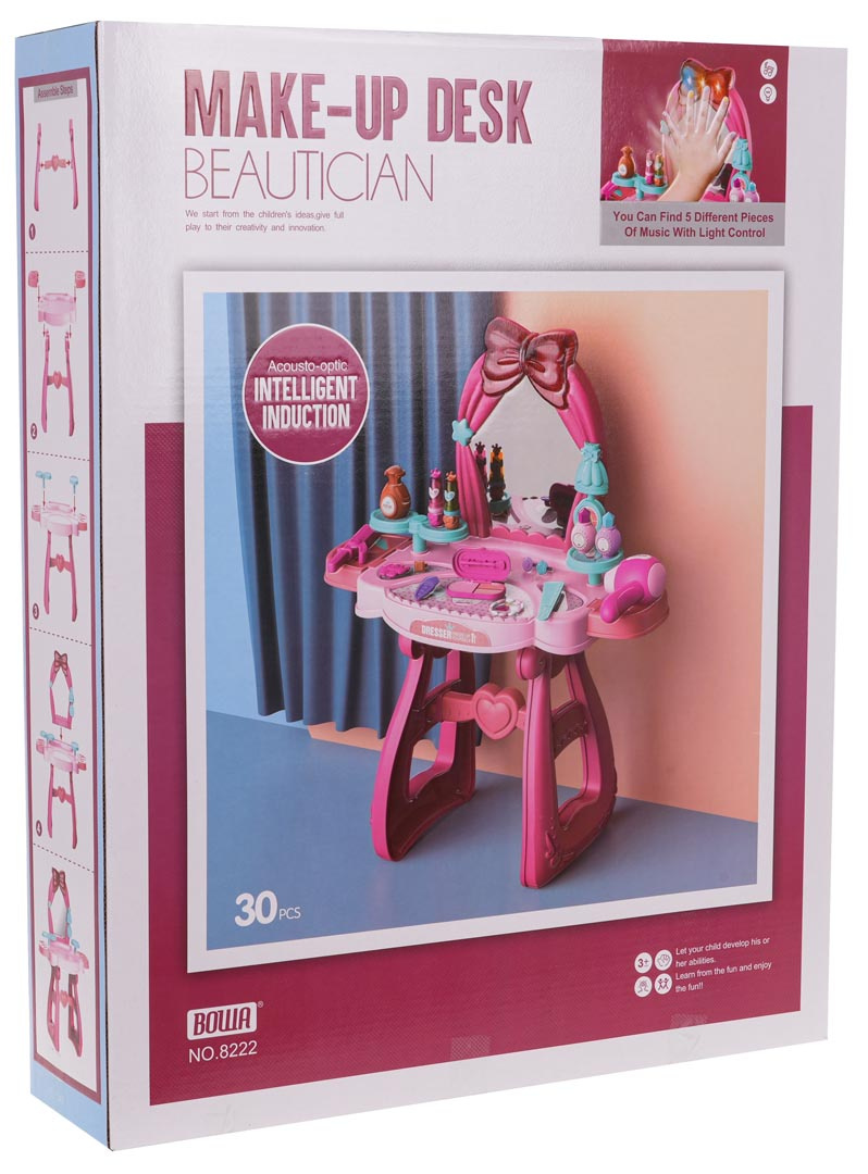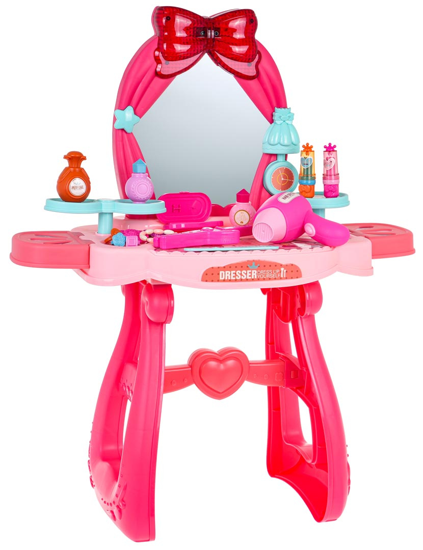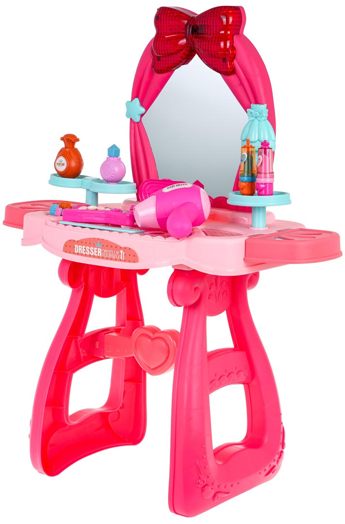 Bohatě vybavený toaletní stolek s množstvím doplňků s funkcí světla a zvuku pro děti od 3 let. Toaletka byla vyrobena z nejkvalitnějšího plastu v bohatých barvách. Napájena je bateriemi typu 3 x AA 1,5 V (baterie nejsou součástí balení). Kokarda nacházející se nad zrcadlem má senzor, který pod vlivem pohybu spouští světelné efekty v podobě blikajících světýlek a zvukové efekty v podobě veselých melodií.