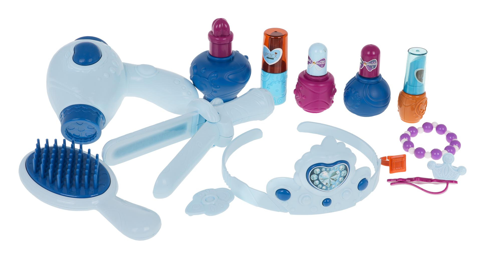 Sada obsahuje také fén, kartáč, žehličku na nehty, laky na nehty, rtěnky, prsteny, náramek, korunku, parfém a sponky do vlasů. Další ozdobné samolepky umožňují ještě větší personalizaci.