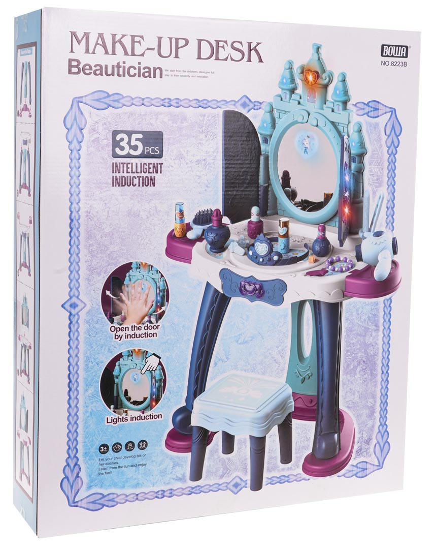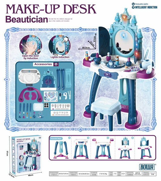 Toaletní stolek má rozměry přibližně 81 x 58 x 28 cm a má velkou desku se zásuvkou a policemi pro uložení veškerého příslušenství. Součástí balení je pohodlná stolička o rozměrech přibližně 18 x 19 x 15,5 cm. Hračka je napájena 3 bateriemi AA, které aktivují světelné a zvukové efekty.