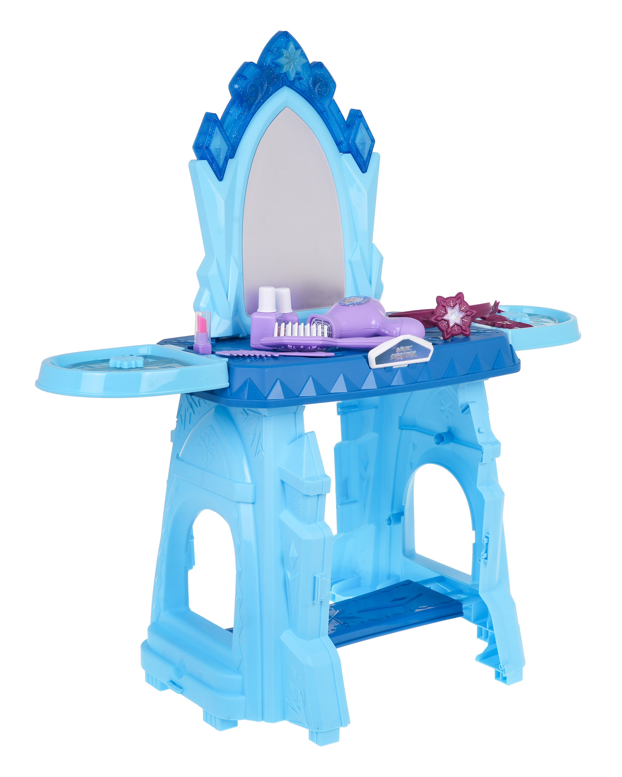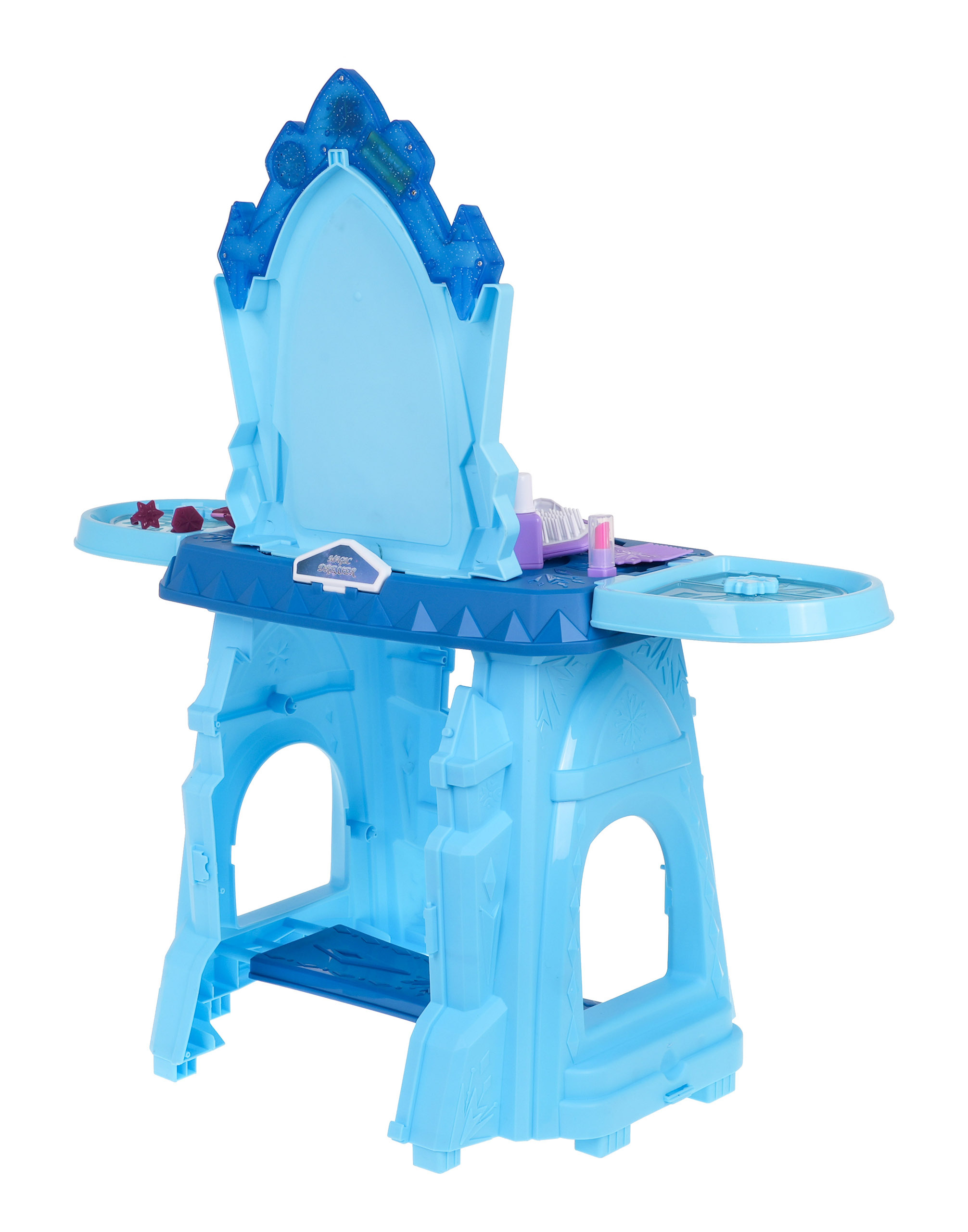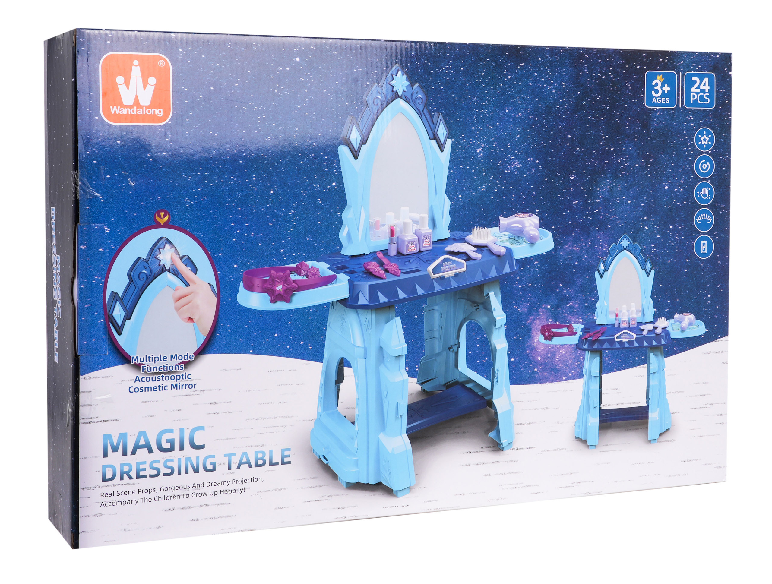 Interaktivní toaletka se zvukovou a světelnou funkcí je vhodná pro děti od 3 let. Sada obsahuje toaletní stolek a figurínu kosmetiky a šperků. Toaleta má velké zrcadlo a nad ním je tlačítko ve tvaru hvězdy, po jehož stisknutí se aktivují zvukové a světelné efekty. Deska a police po stranách toaletního stolku mají výklenky na kosmetiku a šperky. Poličky po stranách lze také otevírat jako okenice.Toaleta je napájena 2 bateriemi AAA 1,5 V (nejsou součástí balení).