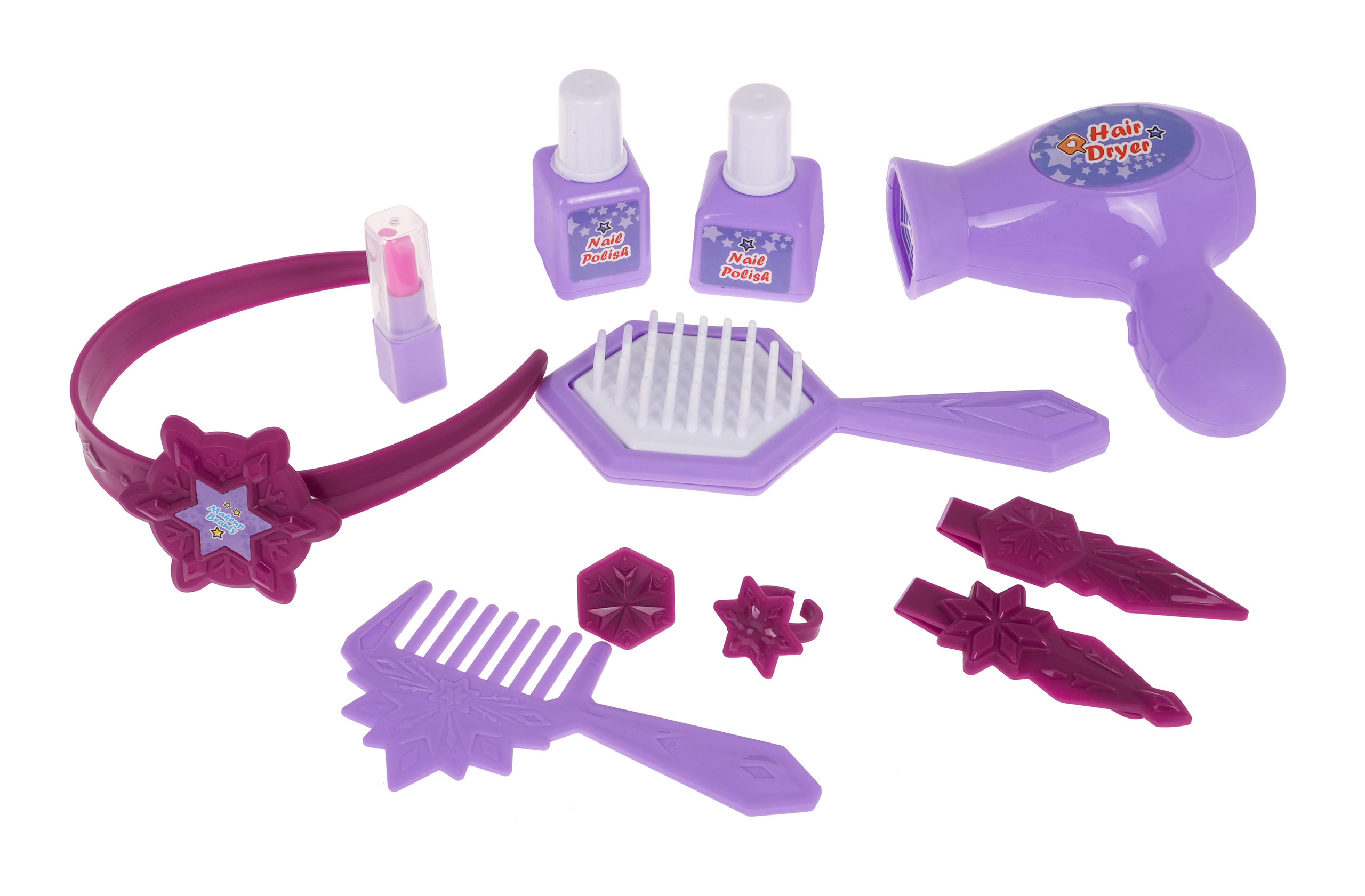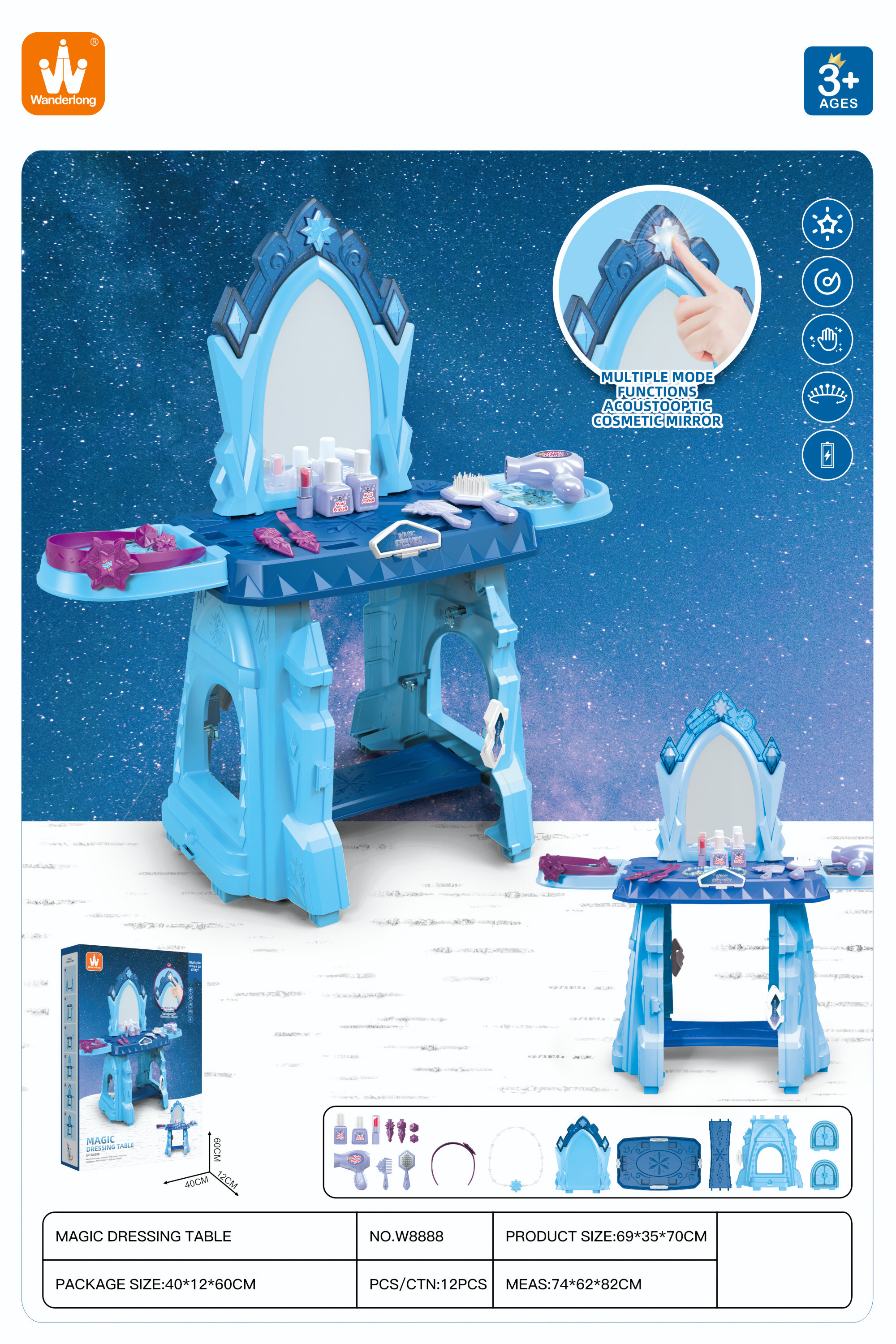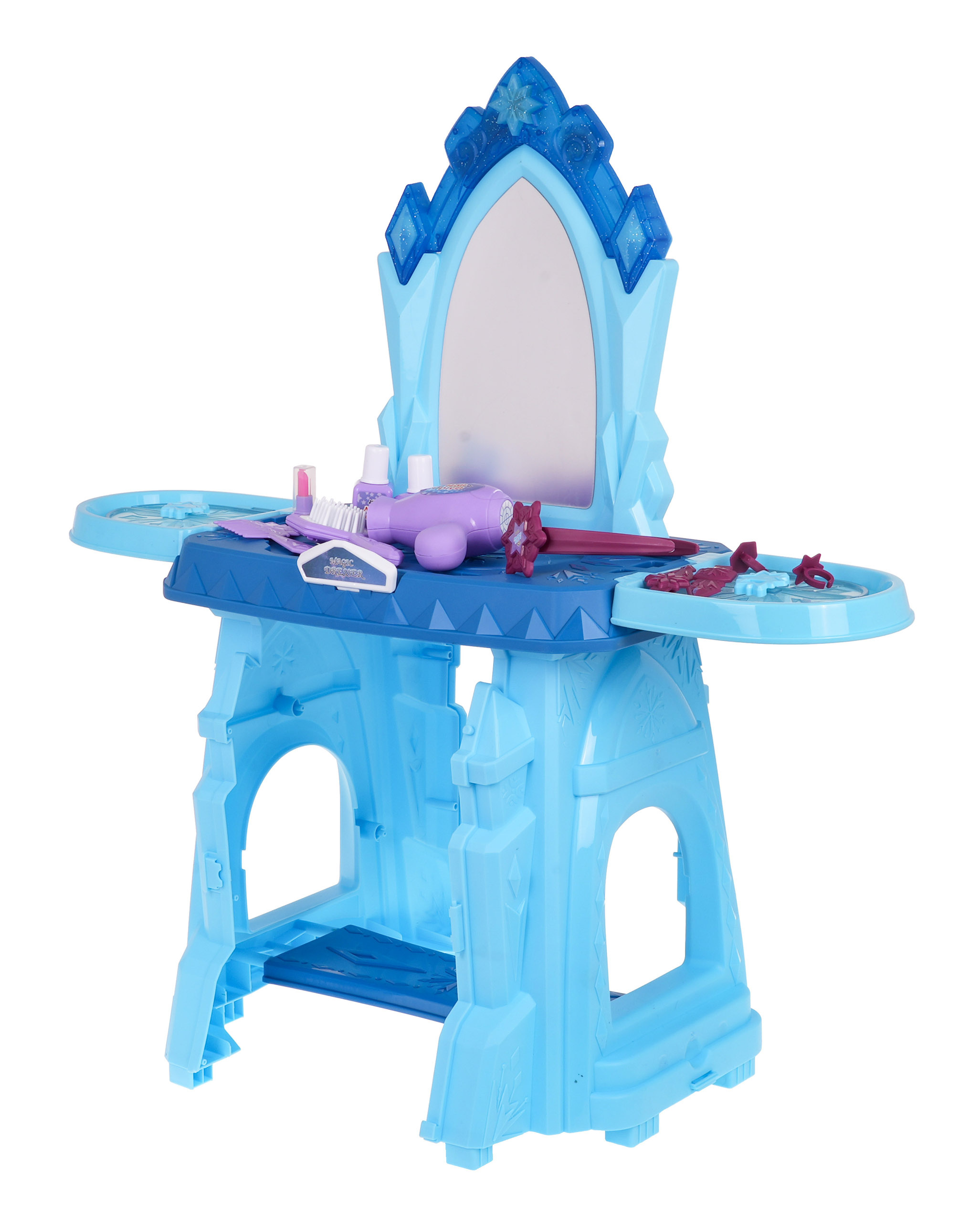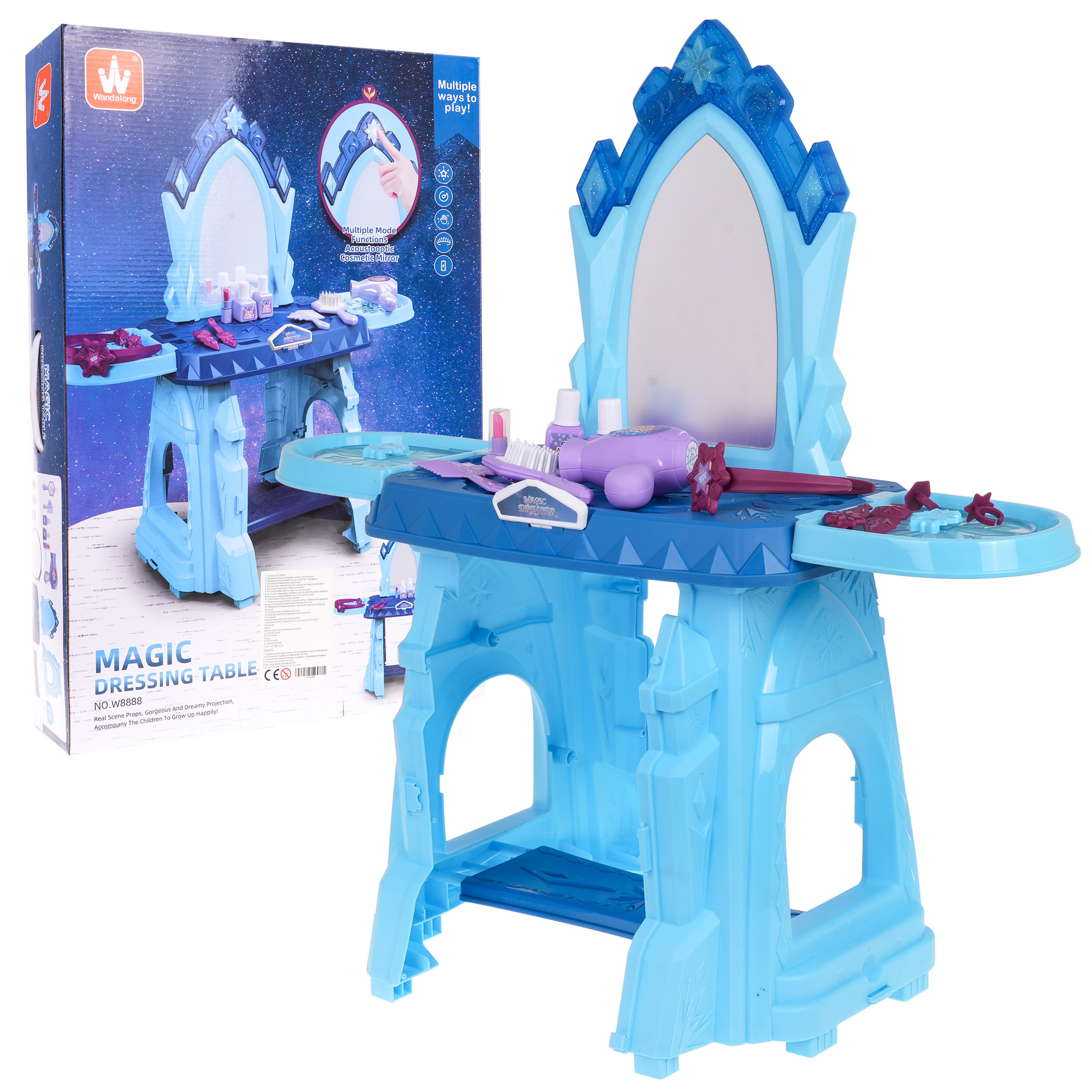 Interaktivní toaletka se zvukovou a světelnou funkcí je vhodná pro děti od 3 let. Sada obsahuje toaletní stolek a figurínu kosmetiky a šperků. Toaleta má velké zrcadlo a nad ním je tlačítko ve tvaru hvězdy, po jehož stisknutí se aktivují zvukové a světelné efekty. Deska a police po stranách toaletního stolku mají výklenky na kosmetiku a šperky. Poličky po stranách lze také otevírat jako okenice.Toaleta je napájena 2 bateriemi AAA 1,5 V (nejsou součástí balení).