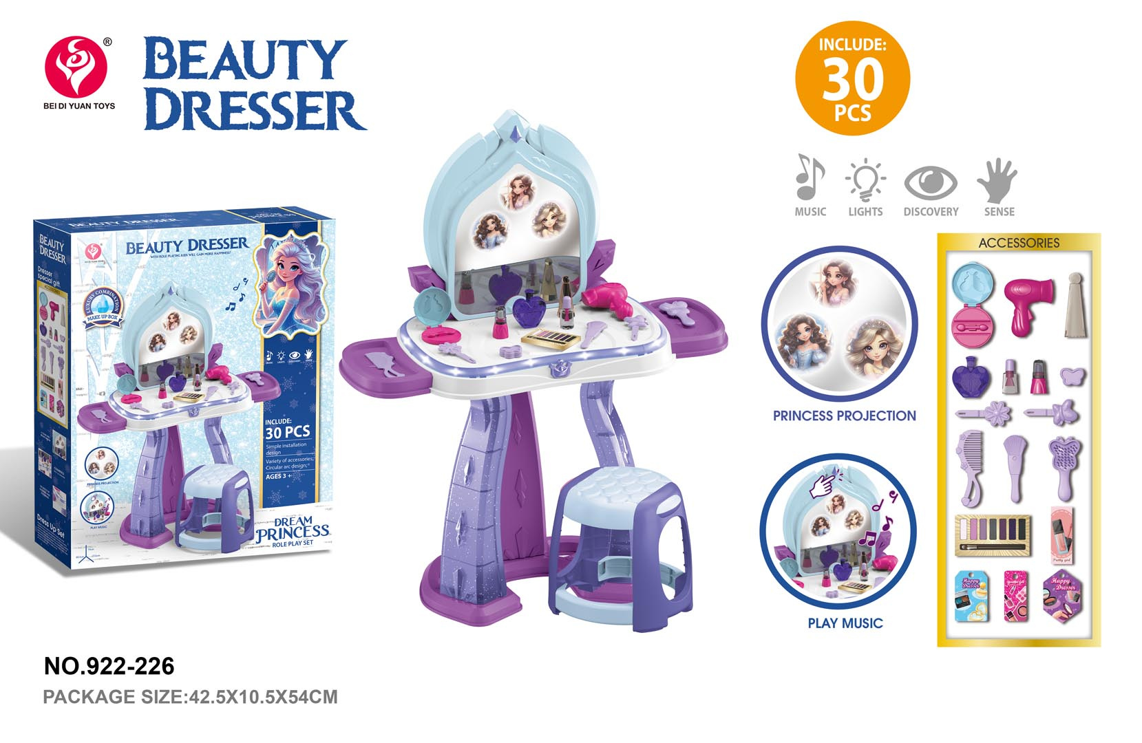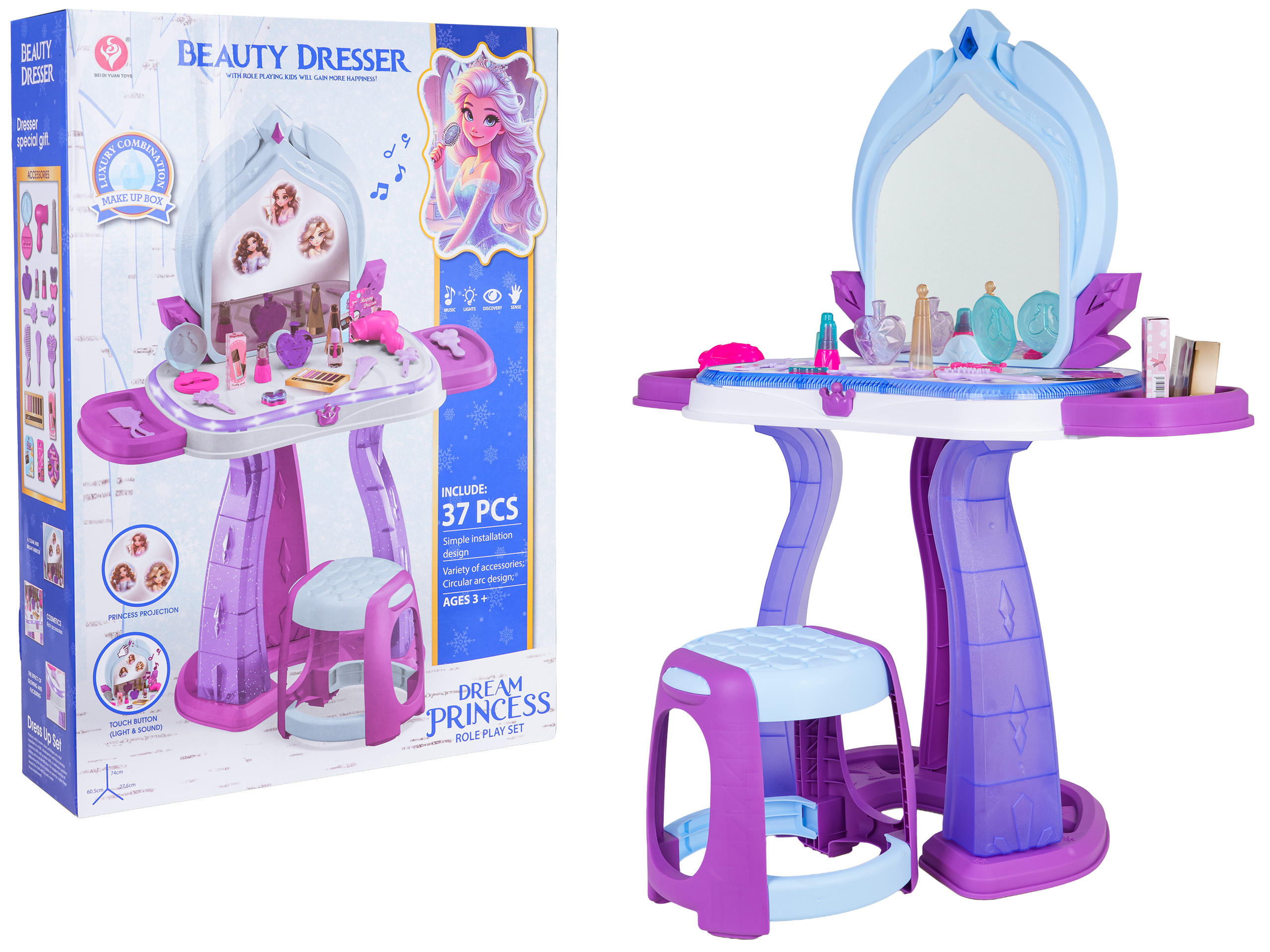 Funkce: - sada vhodná pro děti od tří let, - vyrobený z bezpečných materiálů nejlepší kvality, - živé barvy povzbuzují ke hře, - spousta příslušenství pro péči a kosmetiky, - zvukové efekty: melodie, - světelné efekty: zobrazující se obrázky princezen na zrcadle, osvětlení kolem desky toaletního stolku. |