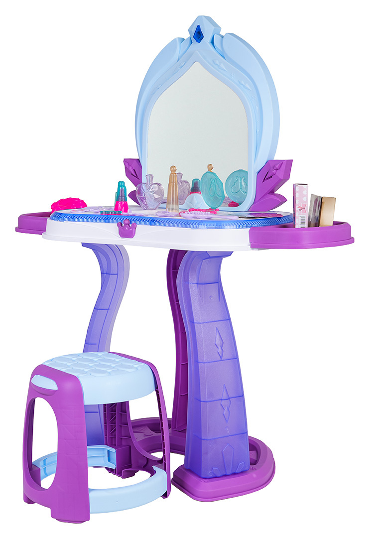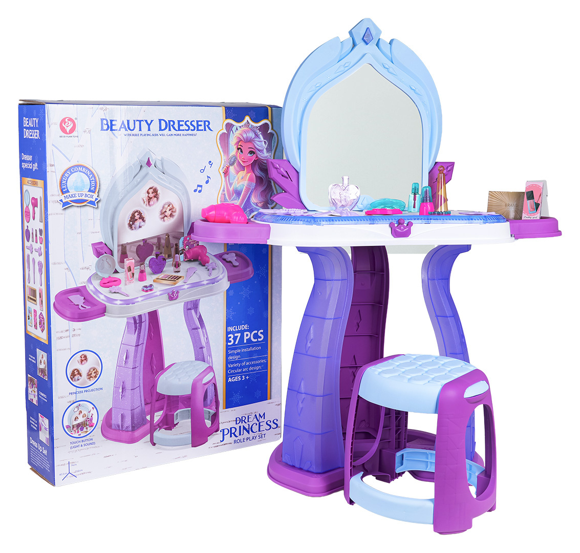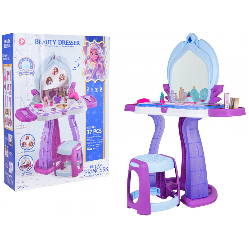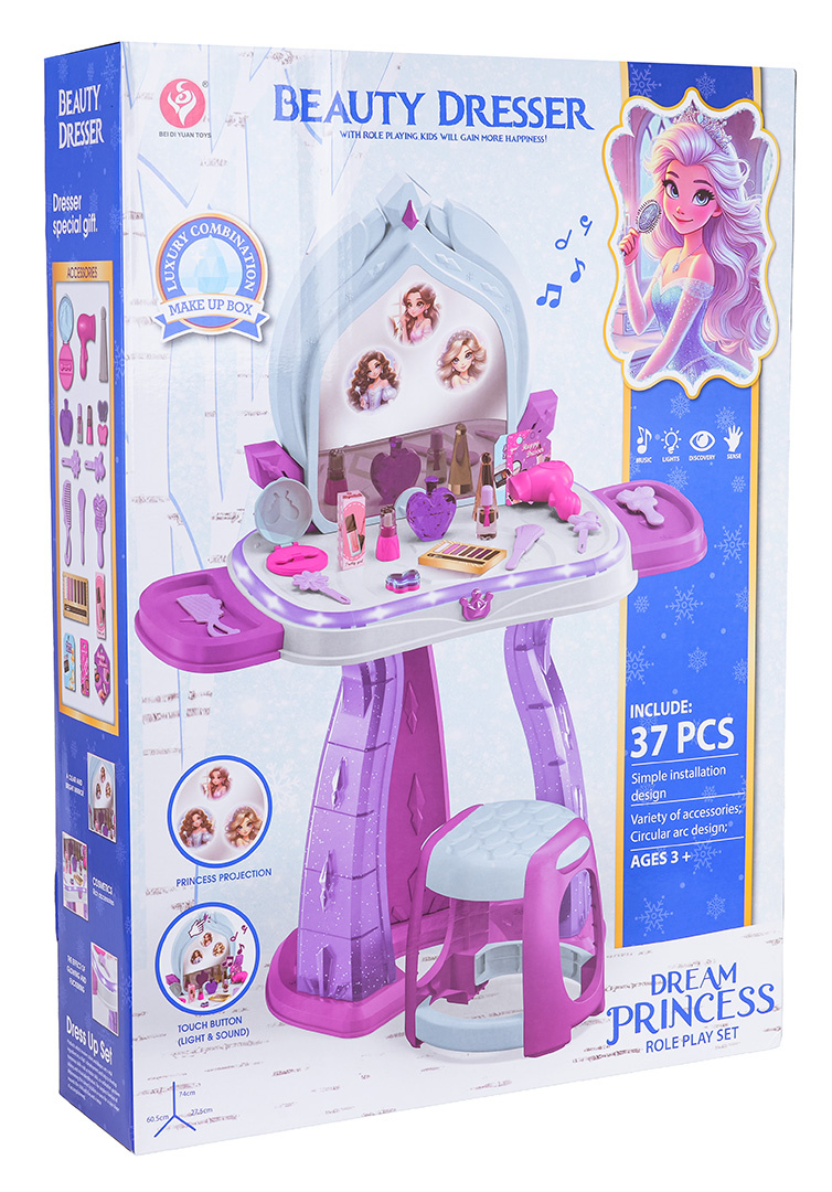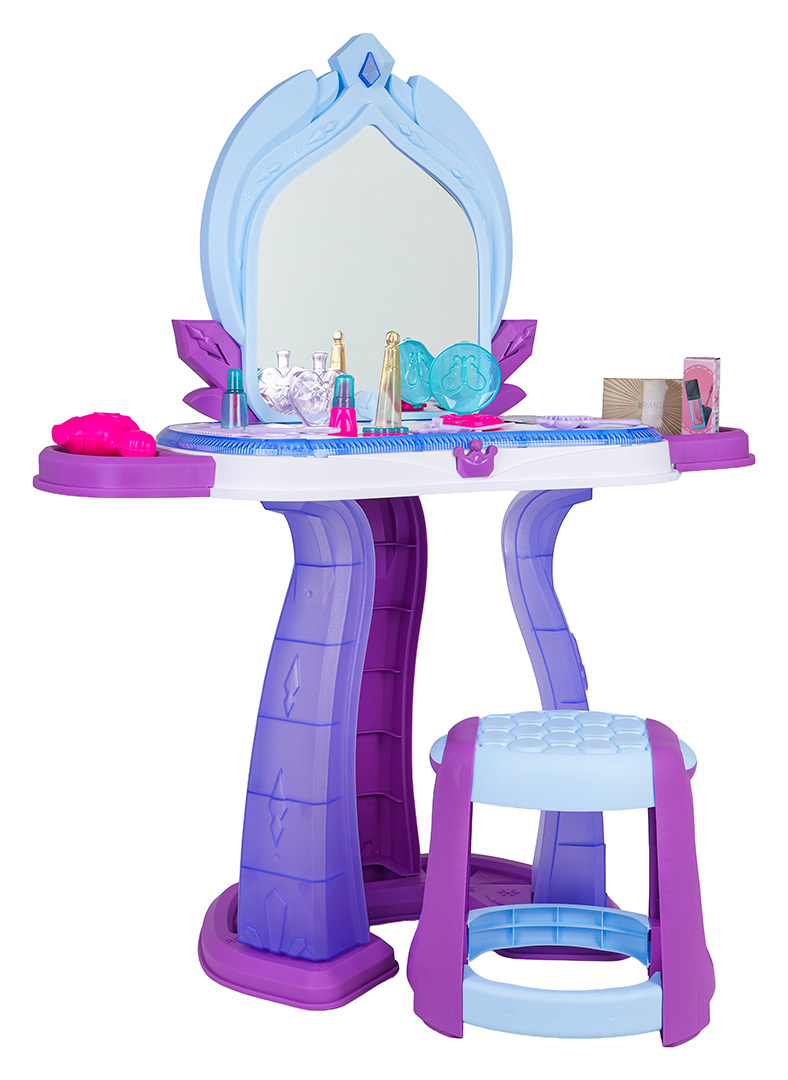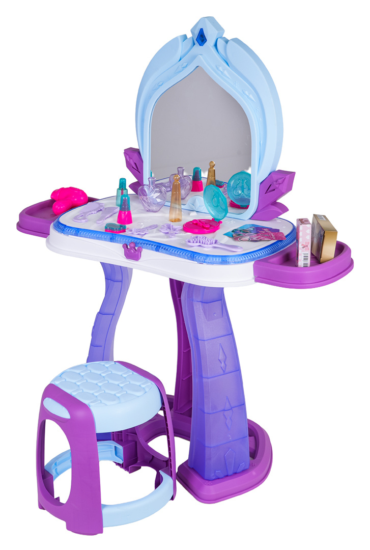 | Interaktivní toaletní stolek s funkcí zvuku a světla pro děti od tří let. Toaletka byla vyrobena z nejkvalitnějších materiálů, bezpečných pro děti, v živých barvách. V sadě se nachází až 37 doplňků pro péči a líčení. Toaletní stolek má osvětlení kolem desky a na zrcadle se zobrazují obrázky princezen. Světelné efekty doprovázejí zvukové efekty ve formě veselých melodií. Hračka je napájena bateriemi typu 3 x AA 1,5V (nejsou součástí balení).
