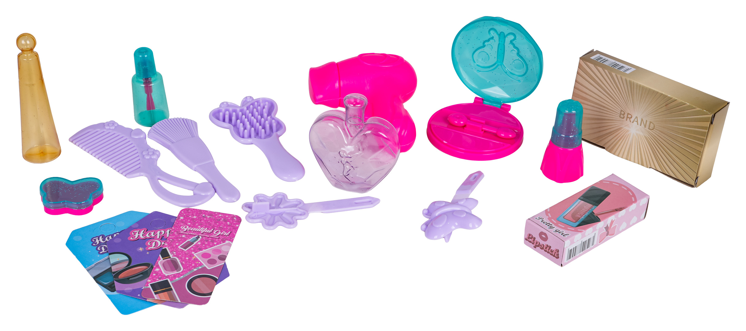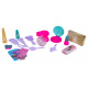 | - konstrukční části toaletního stolku, - stolička, - doplňky a atrapy kosmetiky: fén, oční stíny, lesk na rty, 2 x flakonek na parfémy, hřebínek, kartáč, 2 x sponka, štěteček, rtěnka, lak na nehty, 2 x karton. |