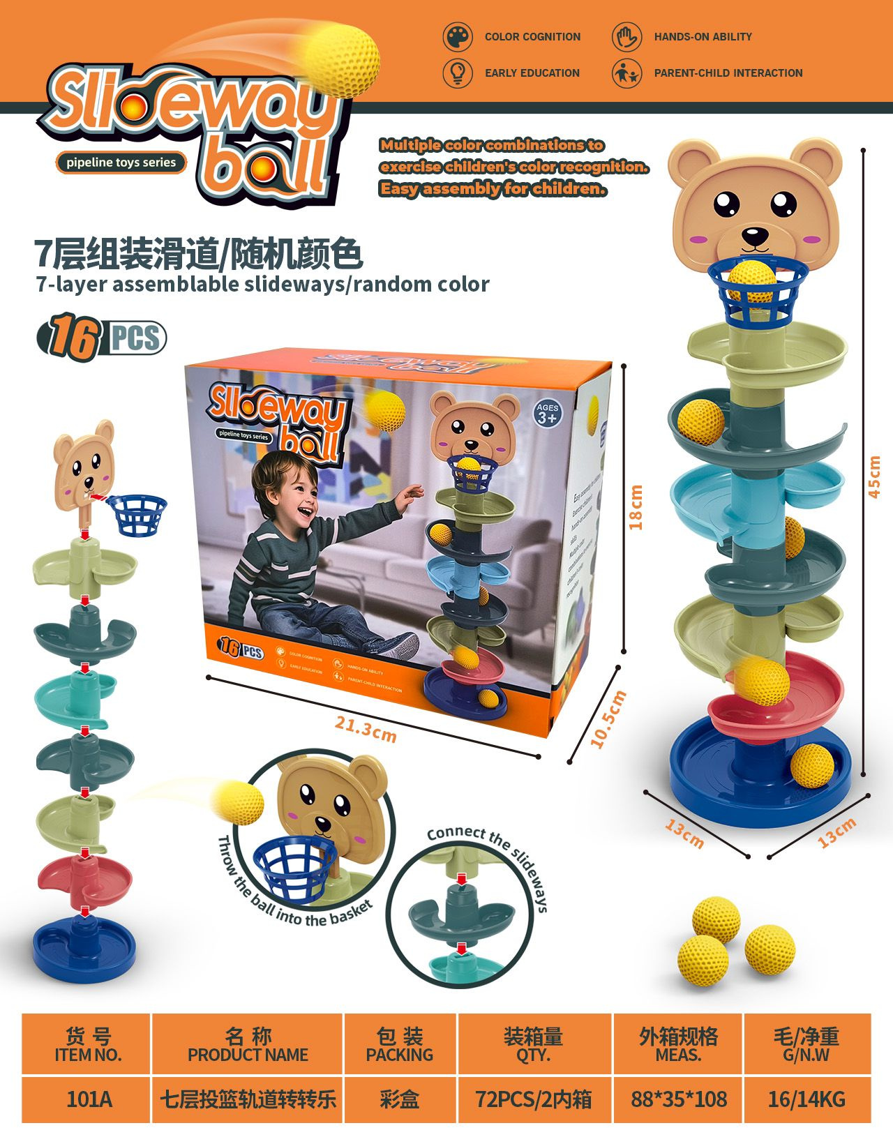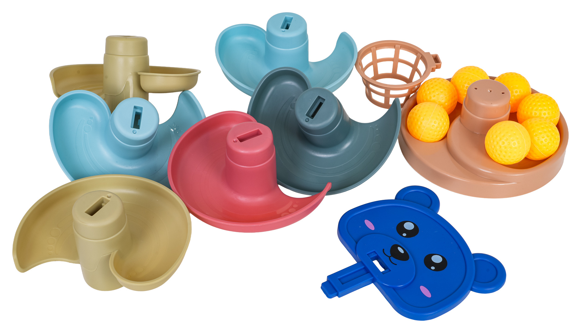 Vícebarevná dráha s medvídkem a míčky pro děti od tří let. Hračka se skládá ze základny, 6 pater a hlavy medvídka s košem. Lze ji libovolně upravovat přidáváním a odebíráním dalších pater. Čím vyšší věž, tím těžší je trefit se do koše. V sadě se nachází 7 míčků.
