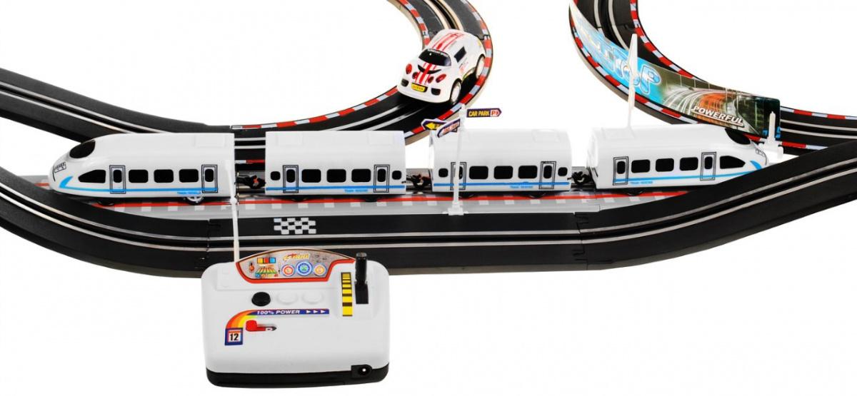 | | - sportovní auto, - vlak, - dvě dálková ovládání (jedno pro vlak a jedno pro auto), - dopravní značky, - pouliční lampy/lampy, - držáky značek a lamp, - svodidla, - sloupy, - 7 samolepek, - 28 dílků kolejí. |