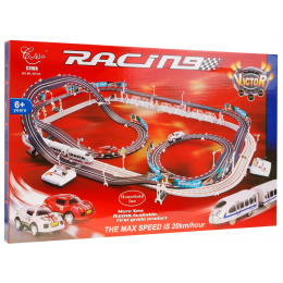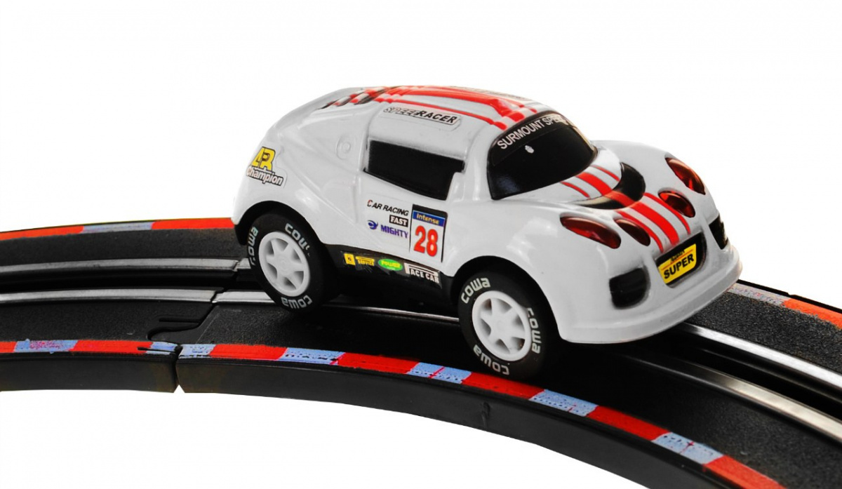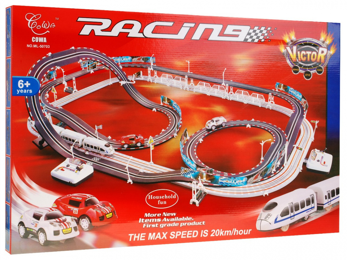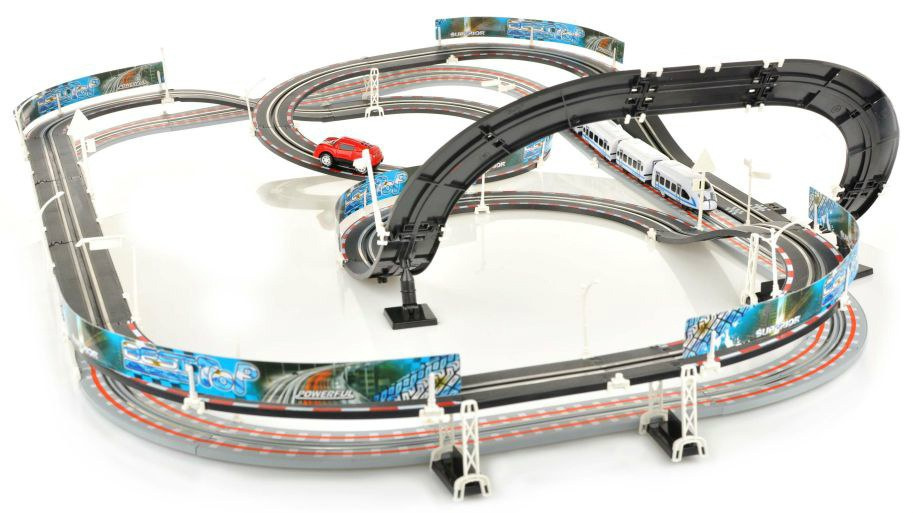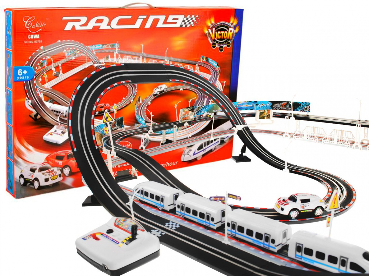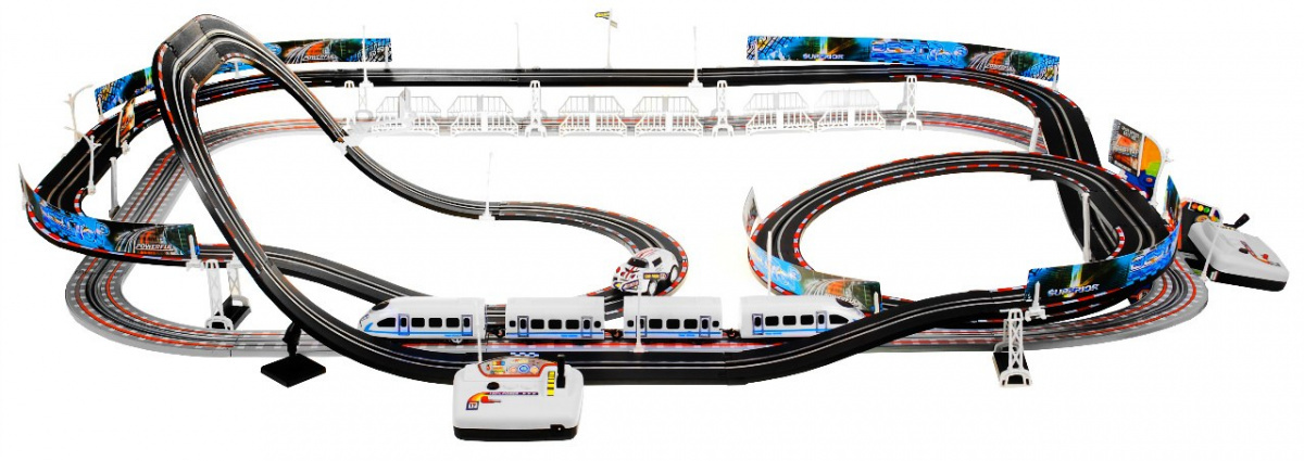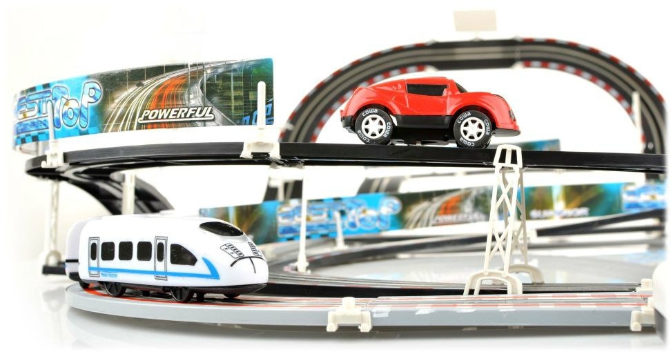 | | Dvojitá závodní dráha, jejíž konstrukční prvky umožňují postavit dráhu s ostrými zatáčkami, serpentinami a rovnými úseky, to vše pro maximální zábavu. Sada má 2 přejezdy bez provozu a 2 smyčky. Díky tomu mohou vůz a vlak jezdit po svých kolejích bez nehod. Dálkové ovladače jsou ergonomicky tvarované tak, aby dokonale padly do dětské ruky a během hry nevyklouzly z rukou. Sada je napájena 4 bateriemi AA (nejsou součástí balení). |