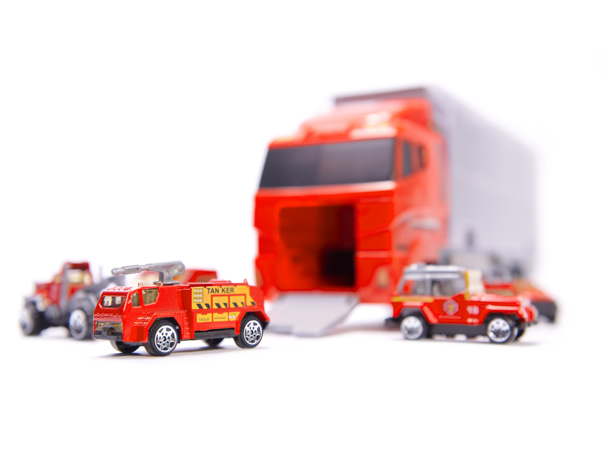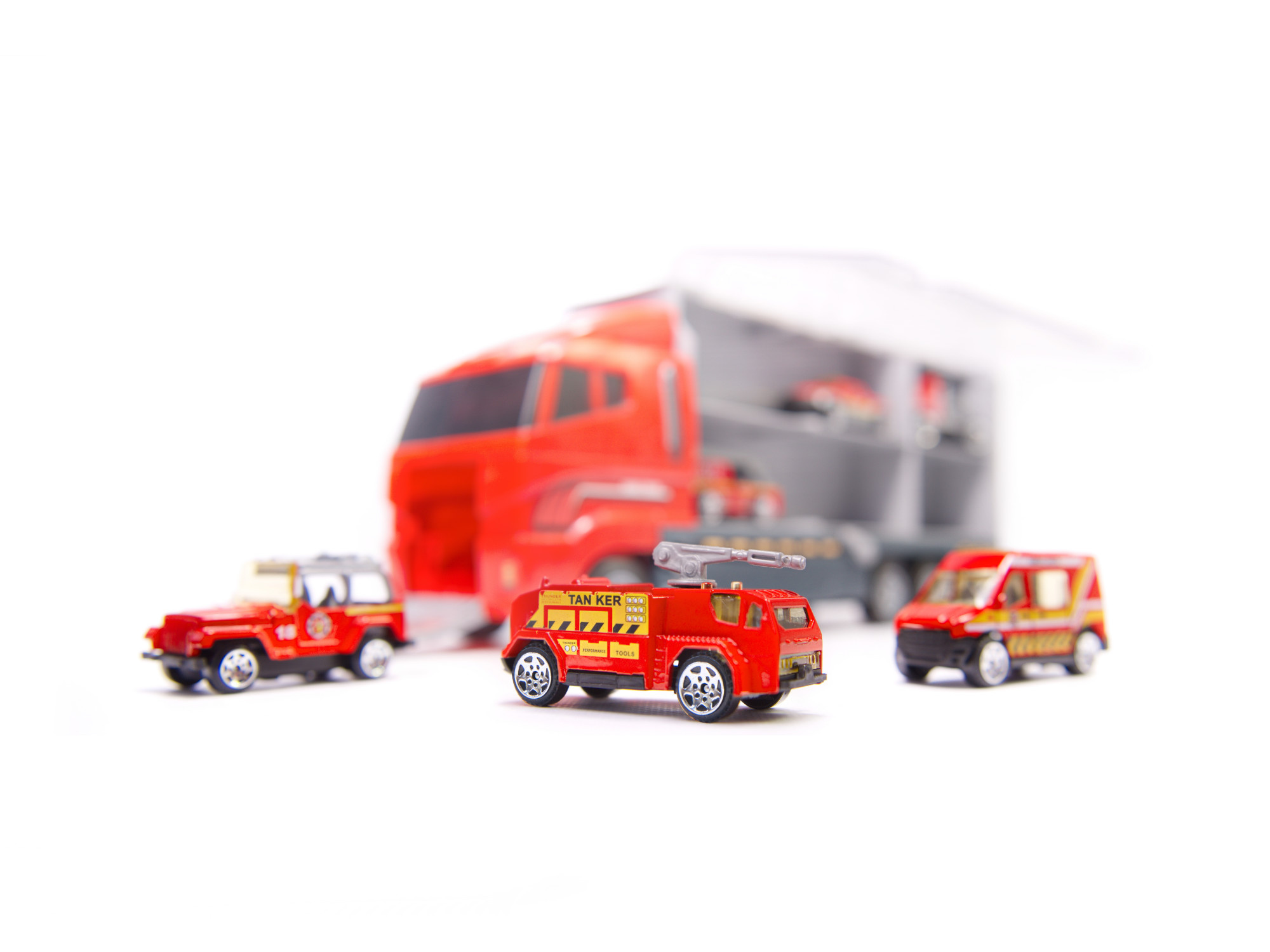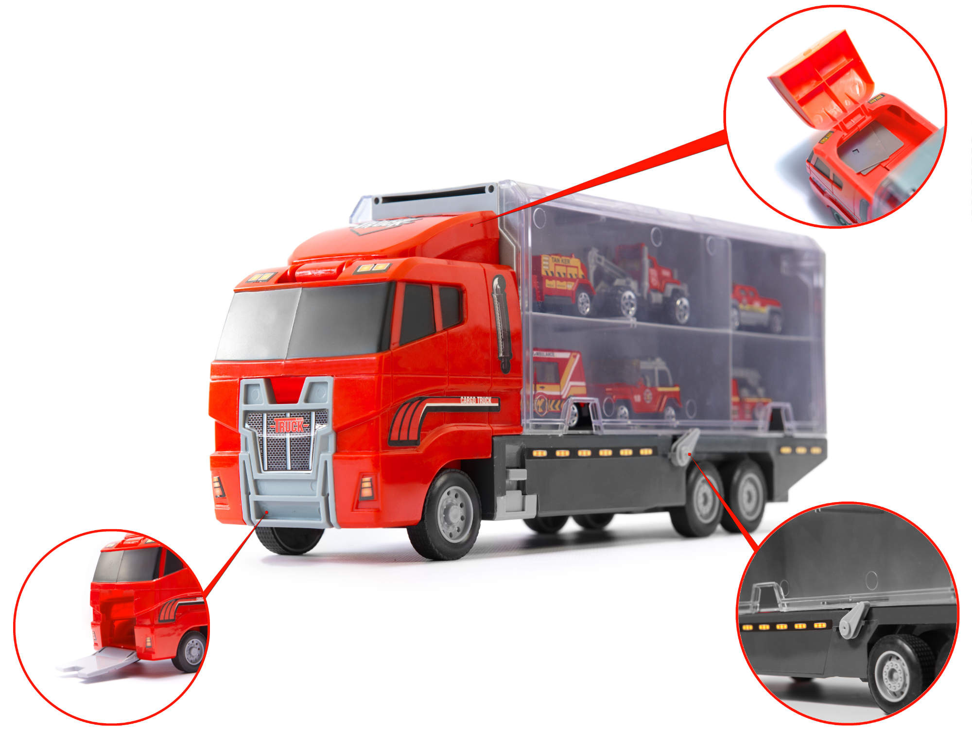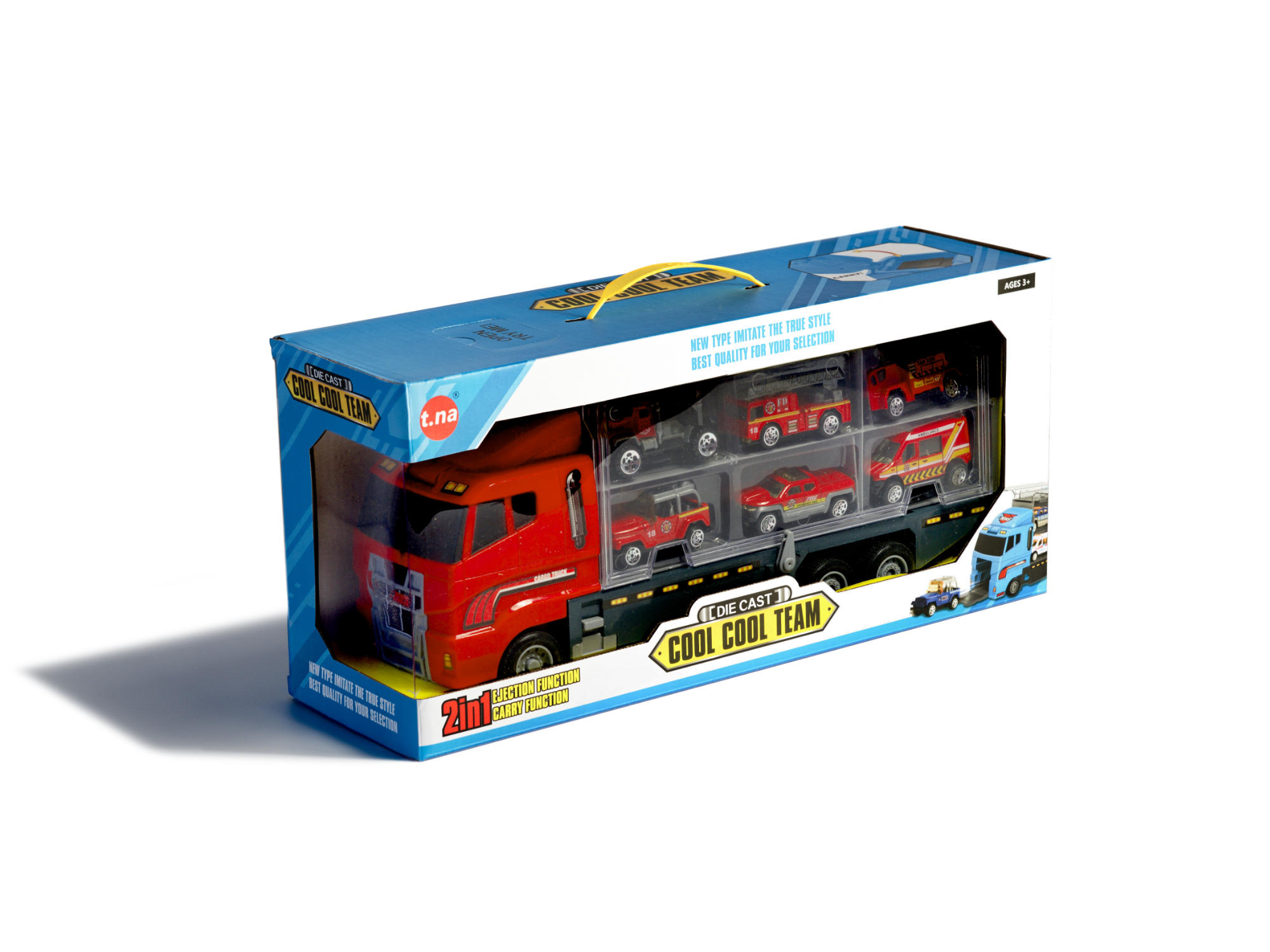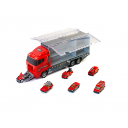Velký nákladní automobil který umožňuje bezpečnou přepravu připojených malých vozů. Malá kovová autíčka dokonale kopírují skutečná vozidla. Každé auto bylo vyrobeno do nejmenších detailů, například zavazadla na střeše terénního vozu, interiér sanitky a závěsný mechanismus. Nákladní automobil na 6 velkých kolech si snadno poradí s jakýmkoli povrchem.