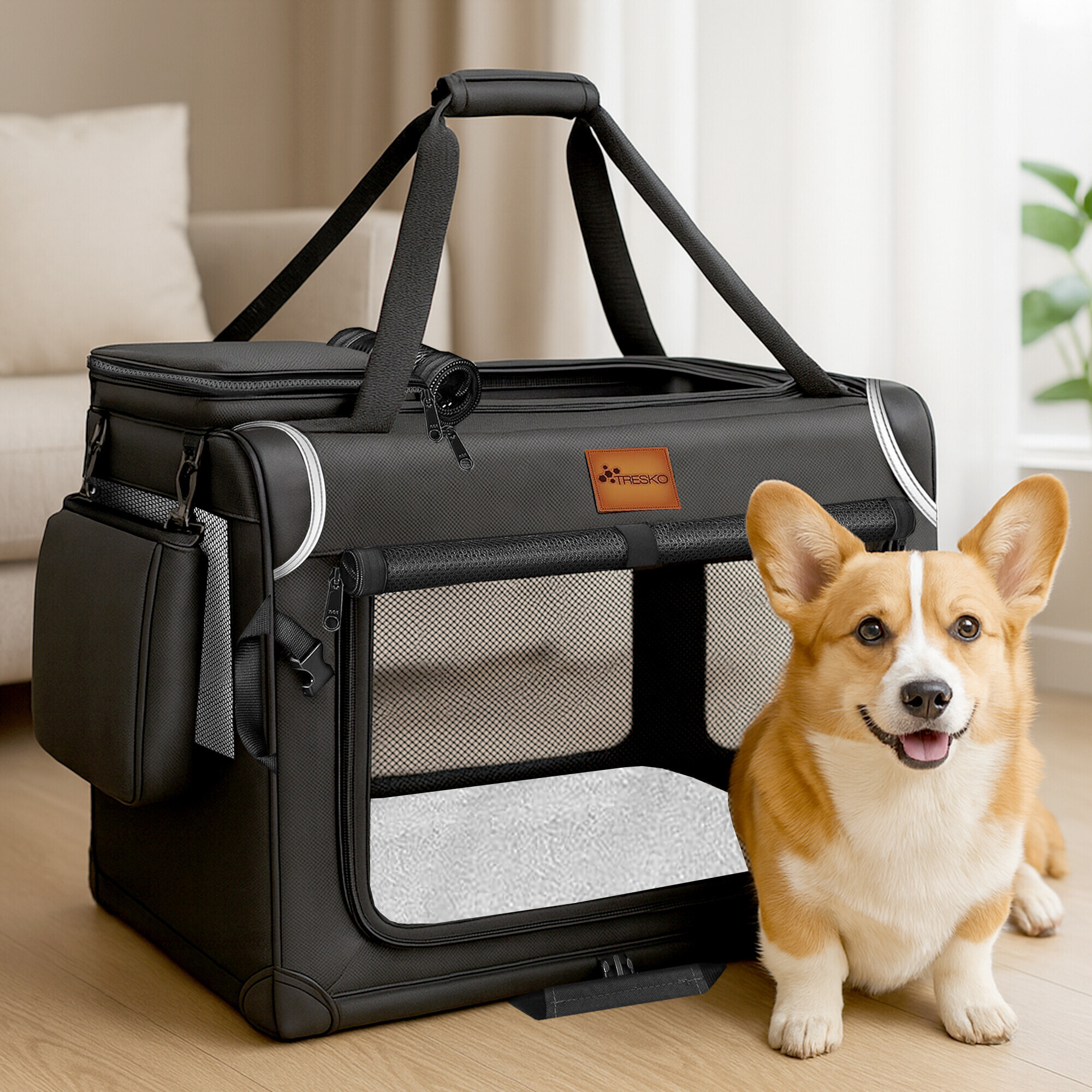 Dvě prostorné kapsy jsou ideální pro uskladnění pamlsků a hraček během výletů k veterináři nebo na dovolenou. Díky skládací ocelové konstrukci lze přepravku rychle složit a rozložit, což usnadňuje její uskladnění a šetří místo. Přepravka je vyrobena z odolného materiálu 600D Oxford, který je snadno udržovatelný.