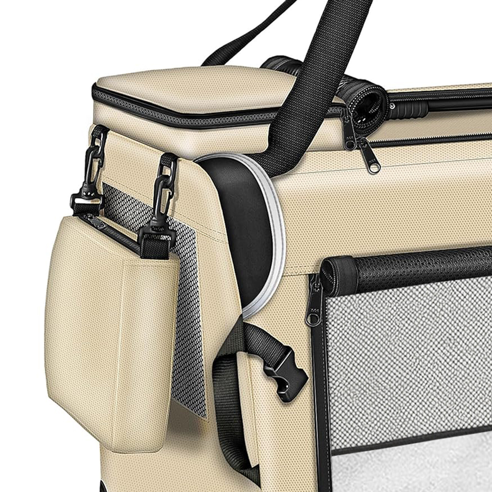 Dvě prostorné kapsy jsou ideální pro uskladnění pamlsků a hraček během výletů k veterináři nebo na dovolenou. Díky skládací ocelové konstrukci lze přepravku rychle složit a rozložit, což usnadňuje její uskladnění a šetří místo. Přepravka je vyrobena z odolného materiálu 600D Oxford, který je snadno udržovatelný.