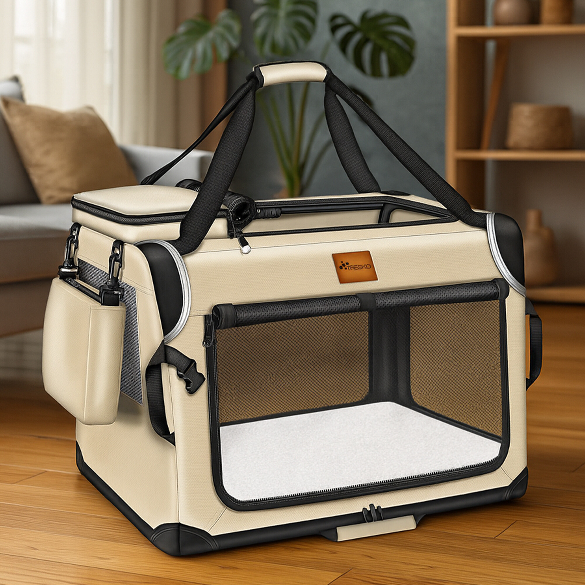 Dvě prostorné kapsy jsou ideální pro uskladnění pamlsků a hraček během výletů k veterináři nebo na dovolenou. Díky skládací ocelové konstrukci lze přepravku rychle složit a rozložit, což usnadňuje její uskladnění a šetří místo. Přepravka je vyrobena z odolného materiálu 600D Oxford, který je snadno udržovatelný.