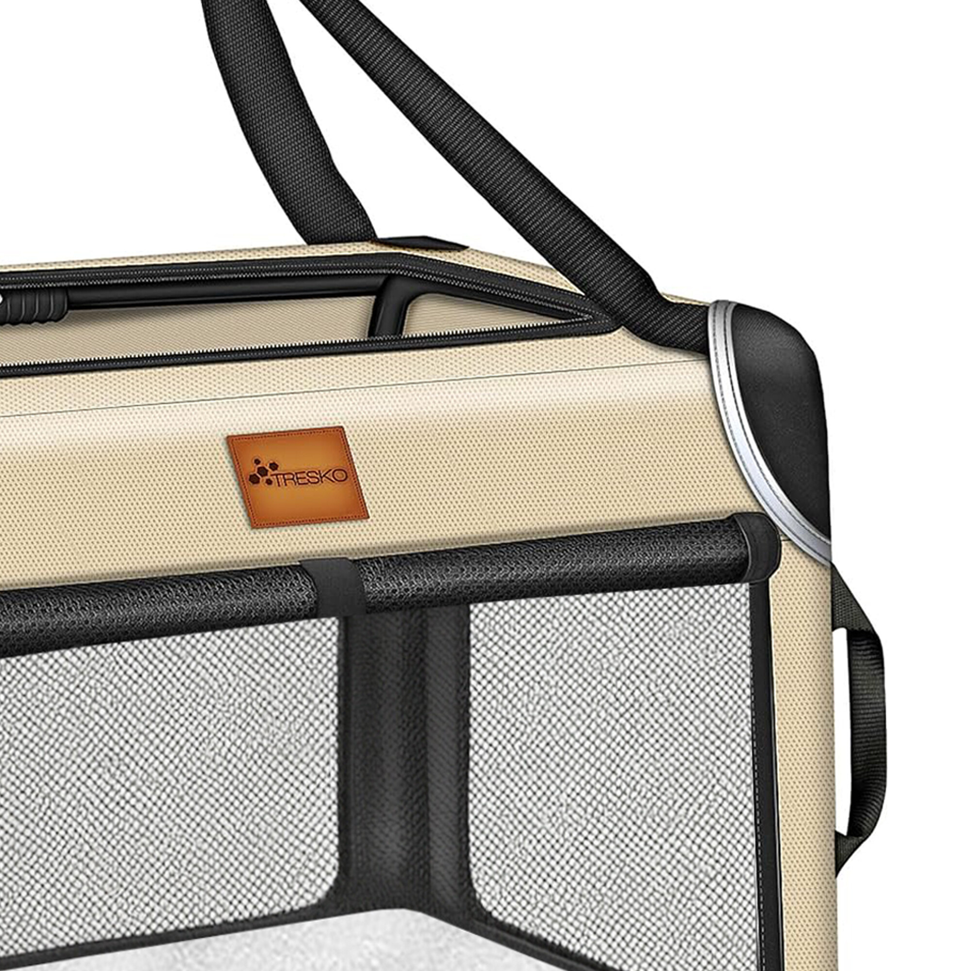 Velké síťované panely na všech čtyřech stranách zabezpečují dostatečné větrání a přívod vzduchu. Horní a přední otvor se zipy umožňují snadný přístup dovnitř i ven.