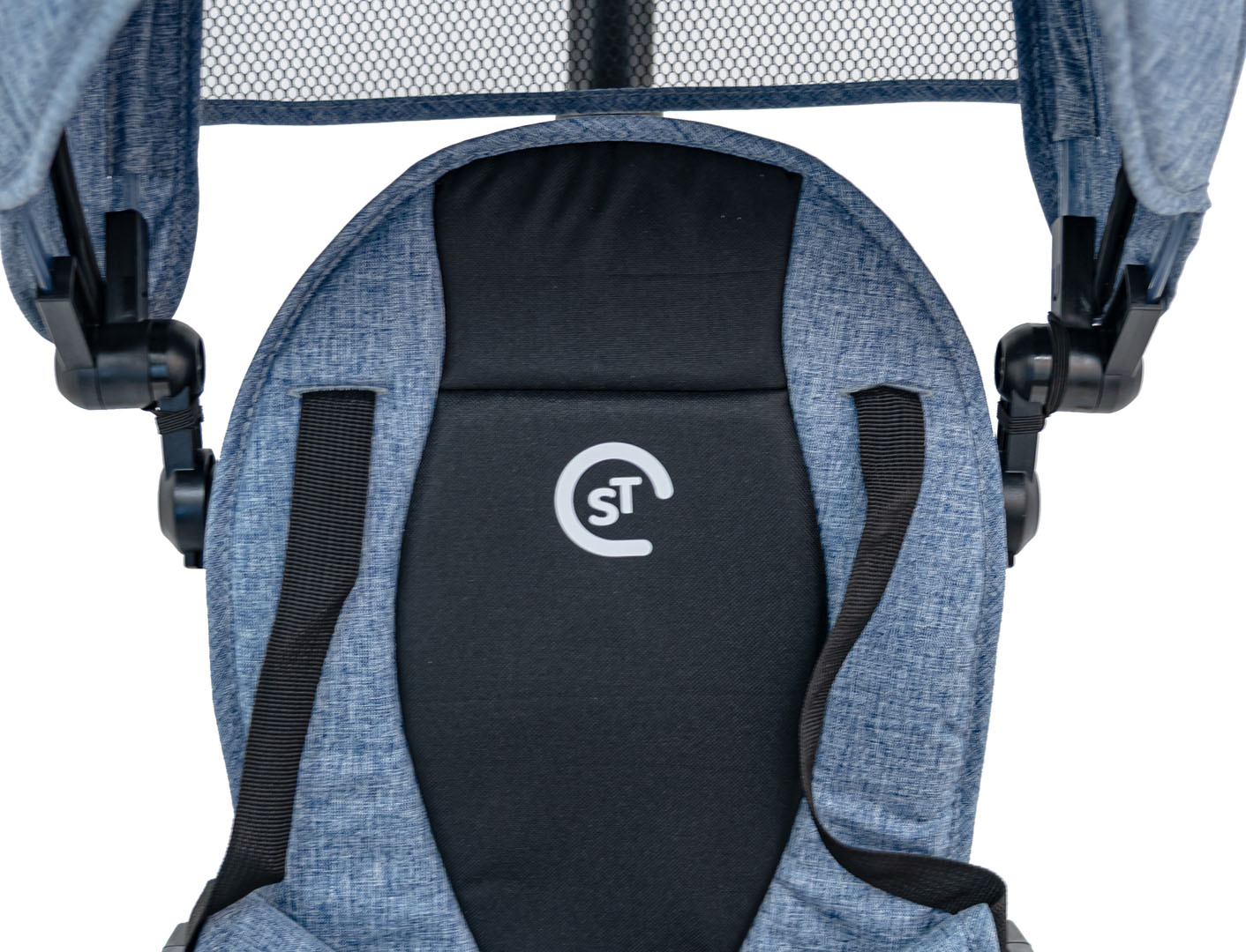 | Sedák | - velmi velká plocha sedadla; 27 x 38 cm, - možnost demontáže opěradla, - měkký potah na sedadlo, - tříbodové, nastavitelné bezpečnostní pásy (další chrániče na pásy a krokový pás), - rozepínatelná, pěnová ochranná bariéra, - rychlá demontáž stříšky a stínítka (patentky), - možnost otočení sedadla. |