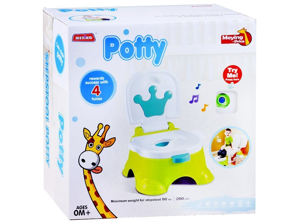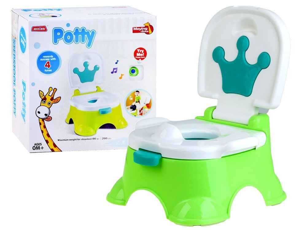 Skutečný nočník pro krále nebo královnu. Nočník hraje veselou hudbu, fanfáry, radost a veselí, když se správně používá. Skvělá věc pro rodiče, kteří chtějí své dítě odnaučit používat pleny. Výrobek lze použít jako plně funkční nočník s klapkou a odnímatelnou nádobou a jako stupínek pod umyvadlo. Nočník je velmi stabilní a pohodlný a snadno se udržuje v čistotě. Je vyroben výhradně z plastu.