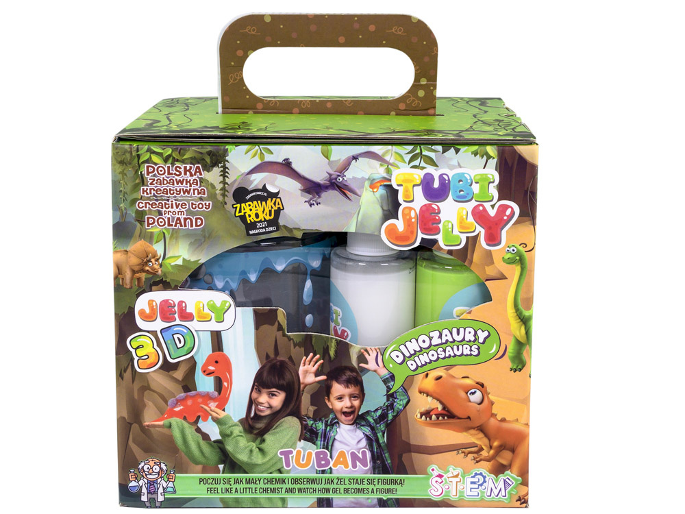 Tubi Jelly Dinosaurs je nejnovější nabídkou společnosti Tuban na vytvoření gelových prehistorických tvorů. Připadejte si jako malý chemik a vytvořte si vlastní sbírku dinosaurů. Gelové tekutiny TUBI JELLY mají mimořádnou sílu. Tvary z nich vytvořené se mění v trojrozměrné postavy. Stačí si na přiloženou fólii namalovat vybraný tvar dinosaura nebo si vytvořit vlastního originálního dinosaura.