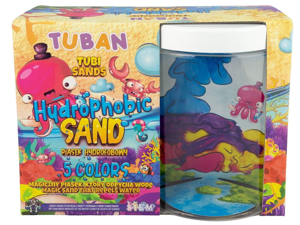 Seznamte se s novým hydrofobním pískem TUBAN, který odpuzuje vodu, aniž by se s ní spojoval. Písek byl ošetřen speciální vrstvou, která udržuje zrnka písku suchá i po ponoření do vody Písek může zůstat ve vodě po dlouhou dobu a po vyjmutí je suchý! Hydrofobicita je nesmírně zajímavý jev, který lze poznat při hře s pískem a vodou TUBAN. Podívejte se, jak s pískem, který se nebojí vody, můžete zachránit oceány před znečištěním, stavět podmořské tvary a stát se kouzelníkem, který vytahuje suchý písek z vody.