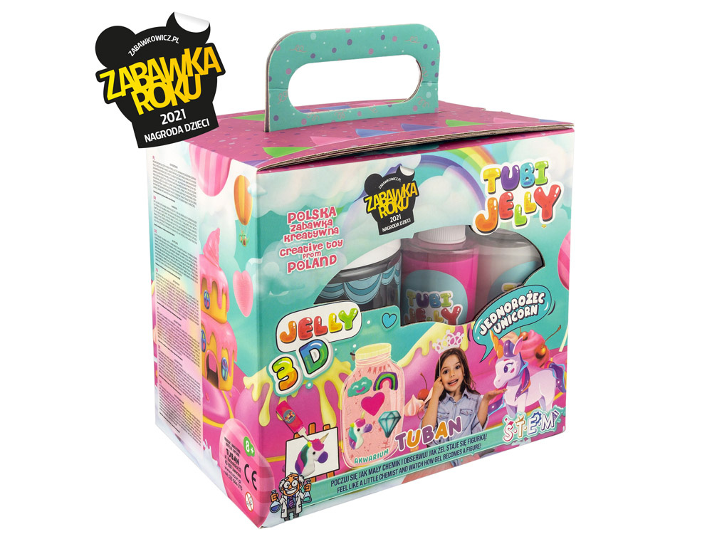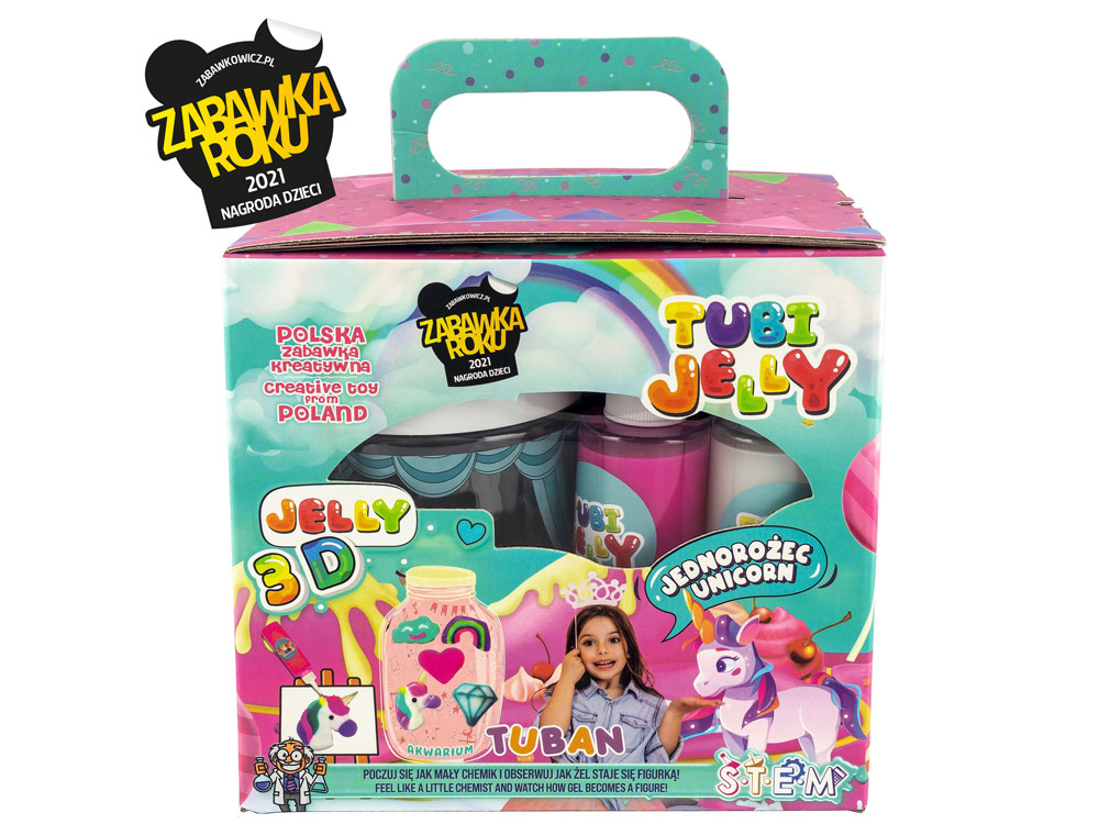 Tubi Jelly je nejnovější nabídka společnosti Tuban pro vytvoření malého barevného akvária. Sada obsahuje plastovou hmotu, která v kombinaci s vhodným aktivátorem umožní vytvořit 3D gelové figurky. Každá sada s malým akváriem obsahuje gely v 6 různých barvách, modré, bílé, růžové, fialové, tyrkysové a třpytivé.