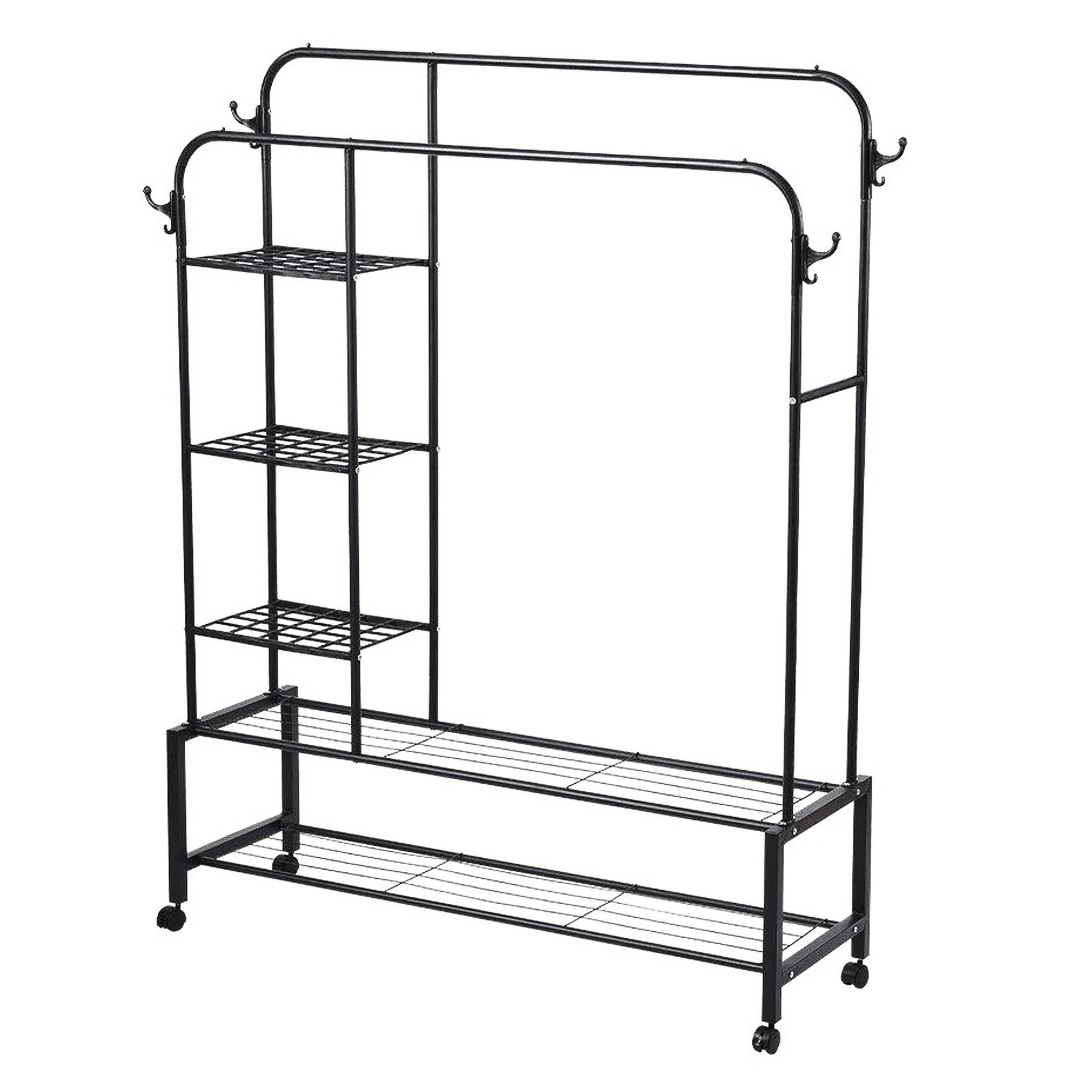 Kovový, velký věšák se 3 policemi. Ocelová konstrukce zaručuje stabilitu. Rozměry produktu: 110x55x160cm prům. trubky; 18mm maximální zatížení 66kg