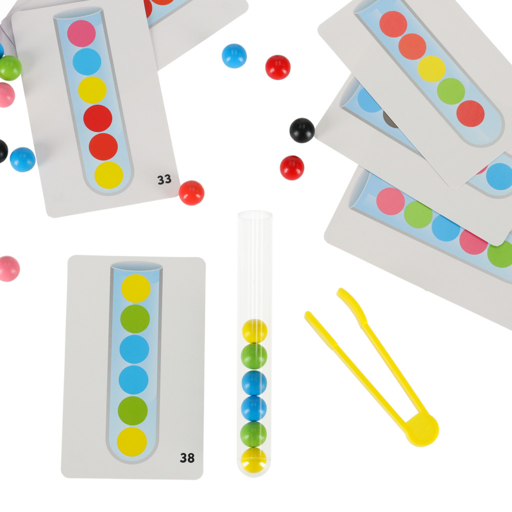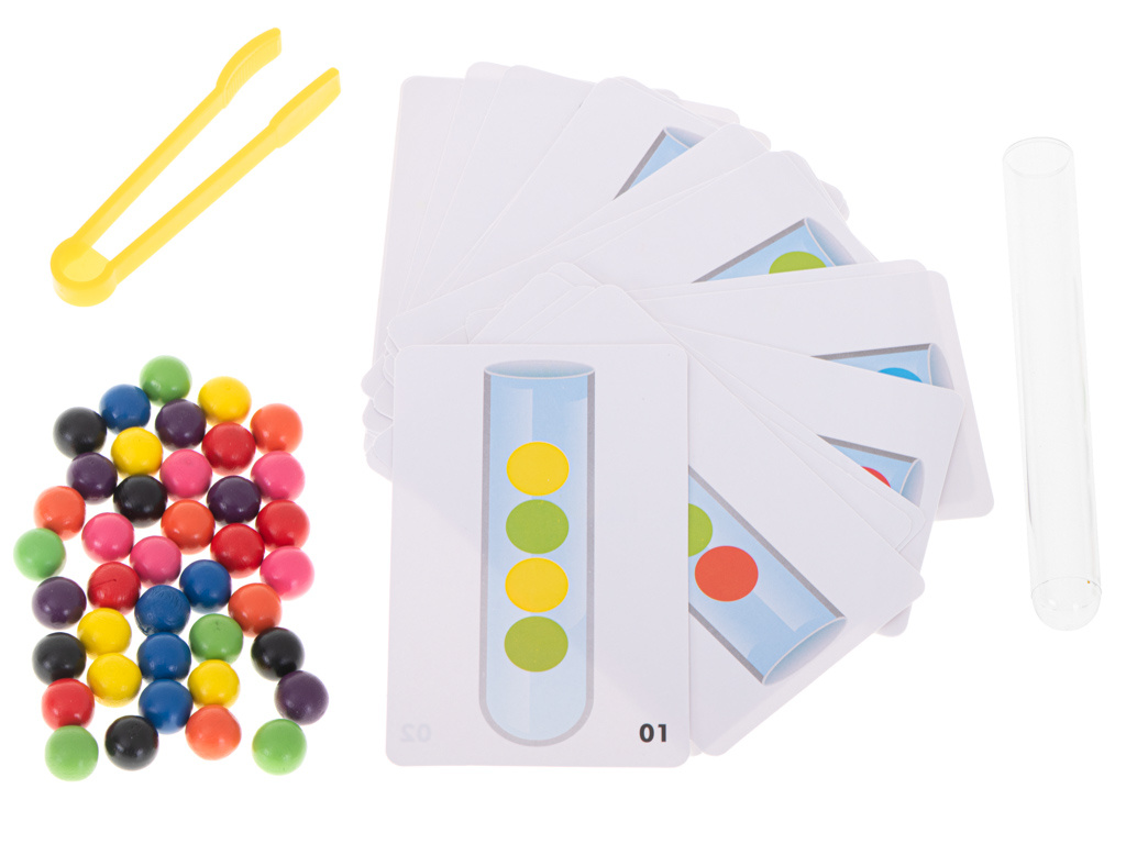 VZDĚLÁVACÍ PUZZLE BAREVNÉ MONTESSORI KULIČKY Je čas spojit zábavu s učením! Dokážete si jako rodič představit něco lepšího? Velká vzdělávací sada vám poskytne hodiny zajímavé a příjemné zábavy! Produkt se řídí zásadami pedagogiky, kterou vytvořila Maria Montessori - hrát si s ním je neuvěřitelně jednoduché a má velkou vzdělávací hodnotu! Hlavním cílem hry je roztřídit kuličky do správných zkumavek! Batole to může dělat rukama nebo pomocí přiložených kleští! Taková zábava je samozřejmě jen návrh! Jediným omezením bude vaše fantazie - nepochybně vás napadne spousta zajímavých nápadů! Sada obsahuje až 40 barevných kuliček, které lze nejen třídit, ale také podpoří vaše dítě při učení počítání a poznávání barev! Kromě toho jsou koule velké, mají průměr 5.5 cm, takže se snadno chytají a obtížně polykají! inspiraci vám poskytne 24 oboustranných karet.ukazují vzory, které je třeba uspořádat ve zkumavce. Úkol se může zdát jednoduchý, ale zpočátku bude jistě náročný! Manipulace s pinzetou zlepší manuální dovednosti vašeho dítěte! zlepší koordinaci očí a rukou a také přesnost a preciznost pohybů rukou a paží! Hra má také pozitivní vliv na řadu intelektuálních schopností.vaše dítě si zlepší své schopnosti soustředění, počítání a rozlišování a pojmenovávání barev! Použité materiály jsou velmi odolné, takže hračka vydrží mnoho hodin učení a zábavy! Obsah sady: