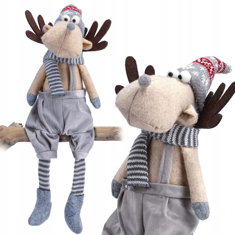 Sob - Los - 50 cm A-989801 Výška: 50 cm (s čepicí a rovnýma nohama) Délka nohou: 18 cm Šířka: 14 cm Díky hmotnosti sedím stabilně, na nohou mám vlněnou čepici, šálu s bílými a šedými pruhy a šedé boty a nejlépe se cítím na krbové římse, u voňavého vánočního stromku ve vánočním obývacím pokoji a v dětském pokoji