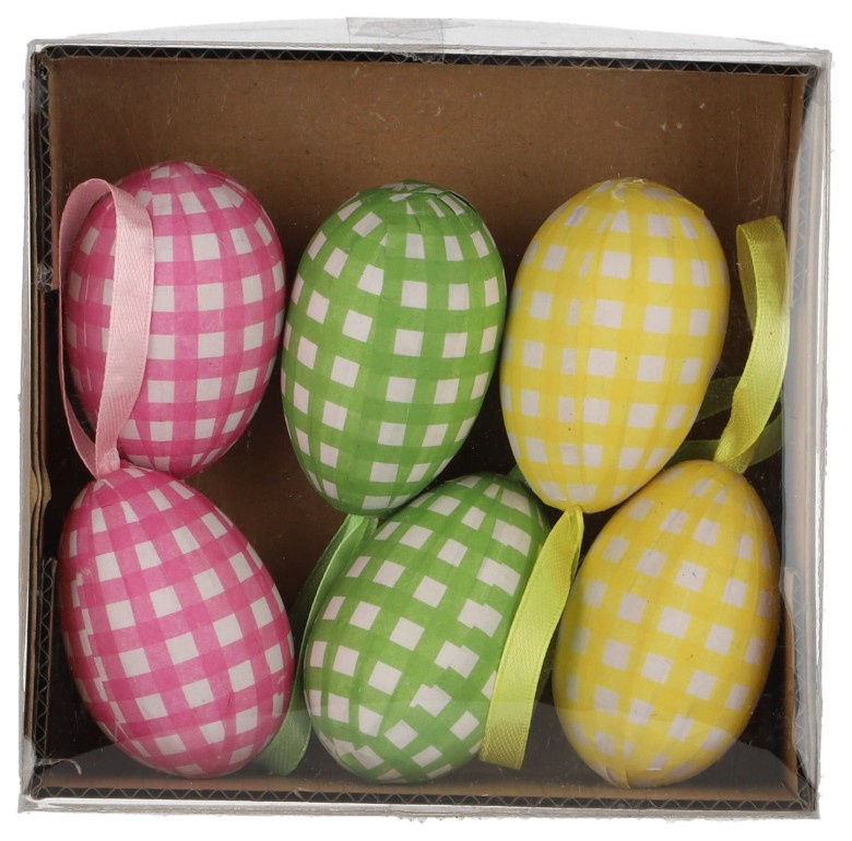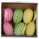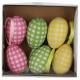 Vejce v krabičce 6 ks. to je roztomilá velikonoční dekorace, která se dokonale hodí do jarního, rustikálního prostředí. Vyrobené z lehkého materiálu, ozdobené klasickým vzorem kostky v jemných, pastelových barvách, tato vajíčka budou krásnou ozdobou na stole, v velikonočních košících nebo jako dekorativní prvek ve vázách s větvičkami. Ideálně se hodí k vytvoření útulné atmosféry na Velikonoce, stejně jako součást jarního interiérového designu. Jednoduchá, ale elegantní kostkovaná vajíčka přinesou do domu radostnou, sváteční atmosféru.