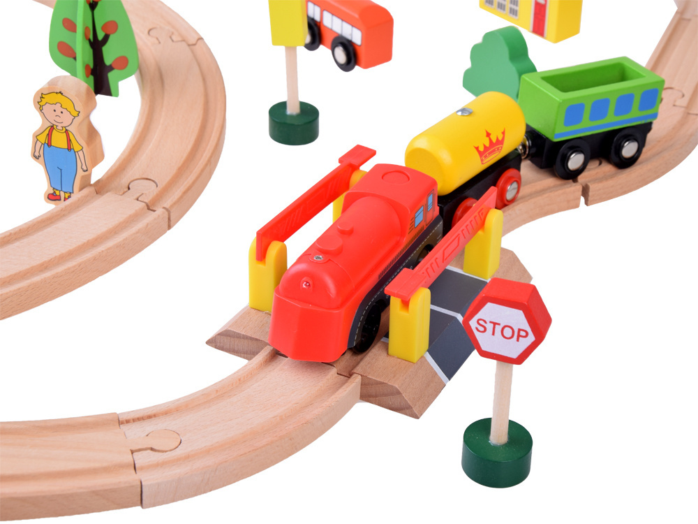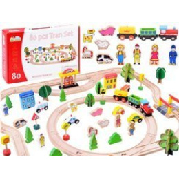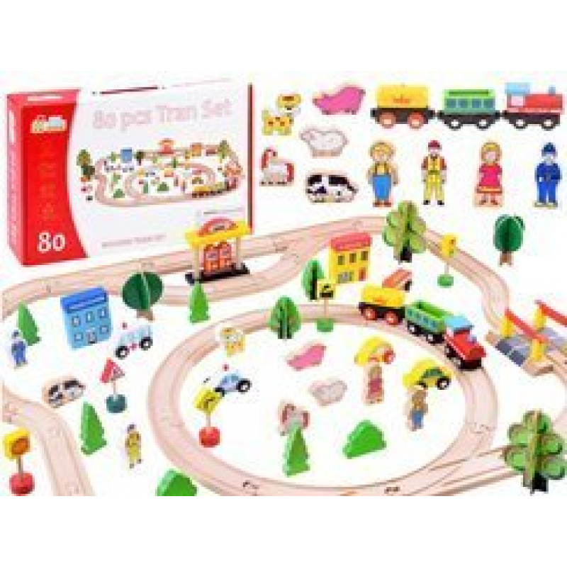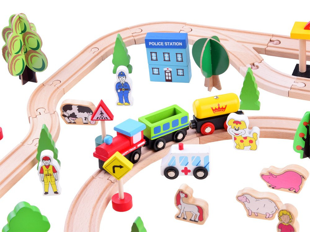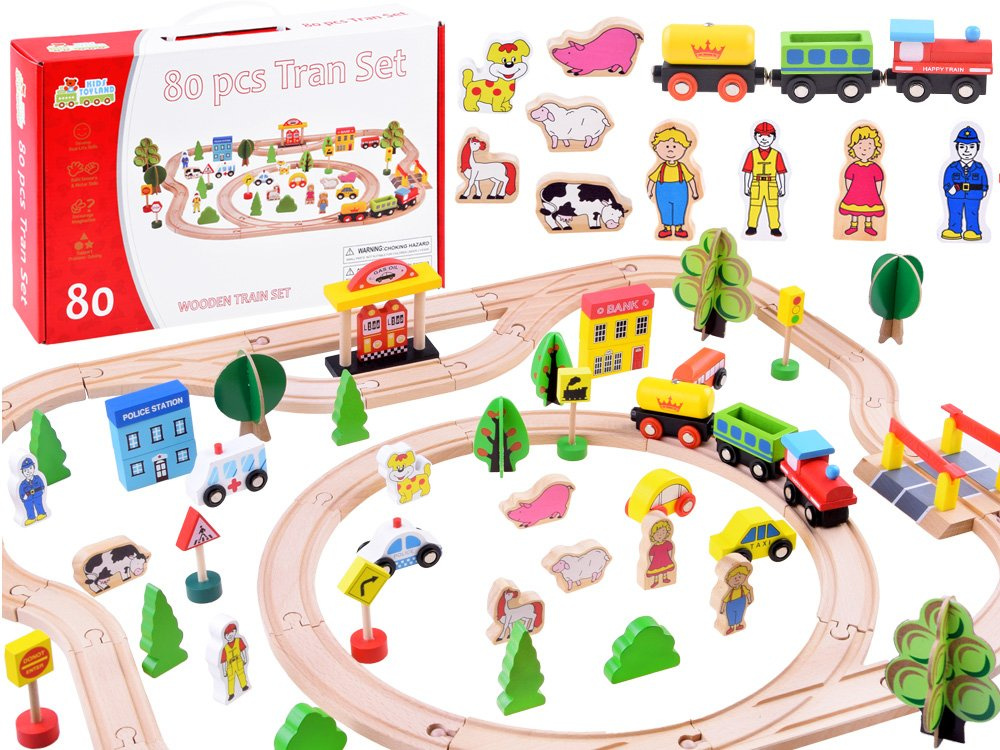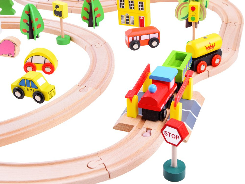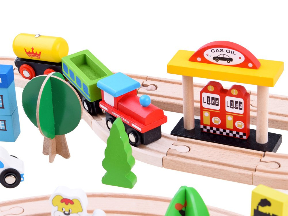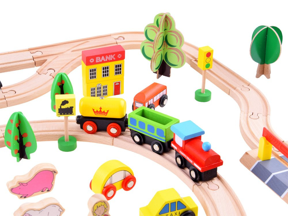 Dřevěná vláčkodráha je skvělá hračka pro nejmenší děti. Skládá se až z 80 prvků a délka dráhy je 360 cm. Každý z nich byl velmi pečlivě a esteticky vyroben ze dřeva s důrazem na každý malý detail. Sada je navržena s ohledem na nejmenší děti, takže všechny dílky jsou barevné, vhodné pro malou dětskou ruku a vyrobené tak, aby zajistily šťastnou a bezpečnou hru. Sada se skládá z vlaku s vagóny (spojenými magnety), kolejí s přejezdem, postaviček zvířat a lidí, dopravních značek, stromů a keřů, aut, budov a čerpací stanice. Tento počet dílků dává vašemu dítěti možnost neomezené hry, můžete si hrát s jednotlivými dílky nebo s jejich pomocí vytvořit krásné barevné město, které kypí životem. Výhodou je, že prvky lze měnit, takže se hraní rychle neomrzí. Nespornou výhodou je, že sada je celá vyrobena ze dřeva. Díky tomu je bezpečnější, odolnější a šetrnější k životnímu prostředí než hračky z plastu.