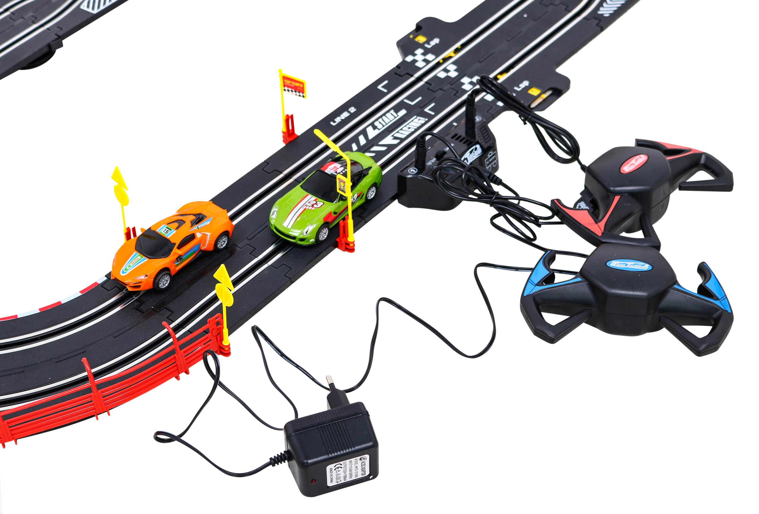 Pro větší požitek ze závodění a bezpečnost jsou vozy vybaveny robustními gumovými pneumatikami , které poskytují lepší přilnavost. Tratě jsou navíc v rozích zajištěny žlutými zábranami .