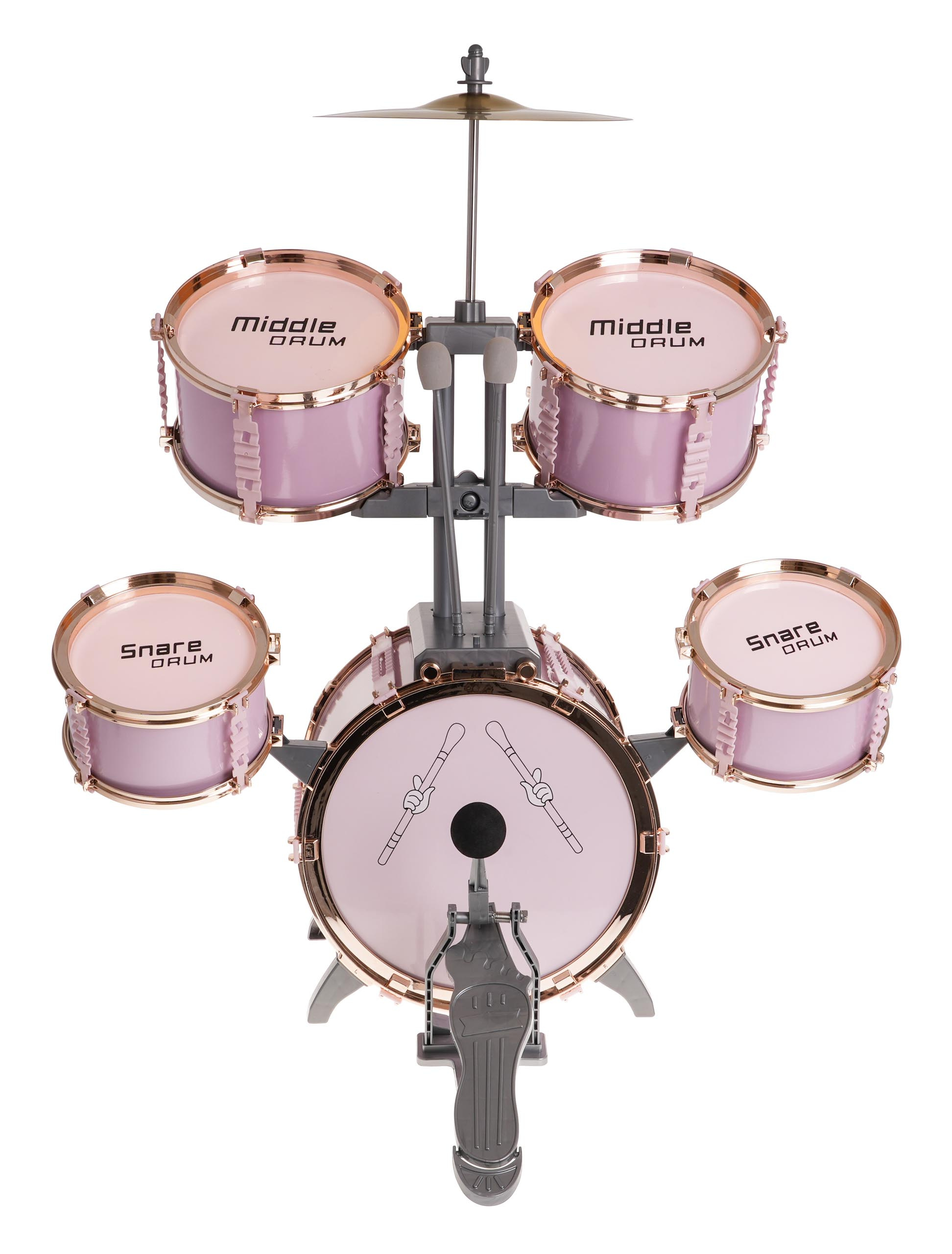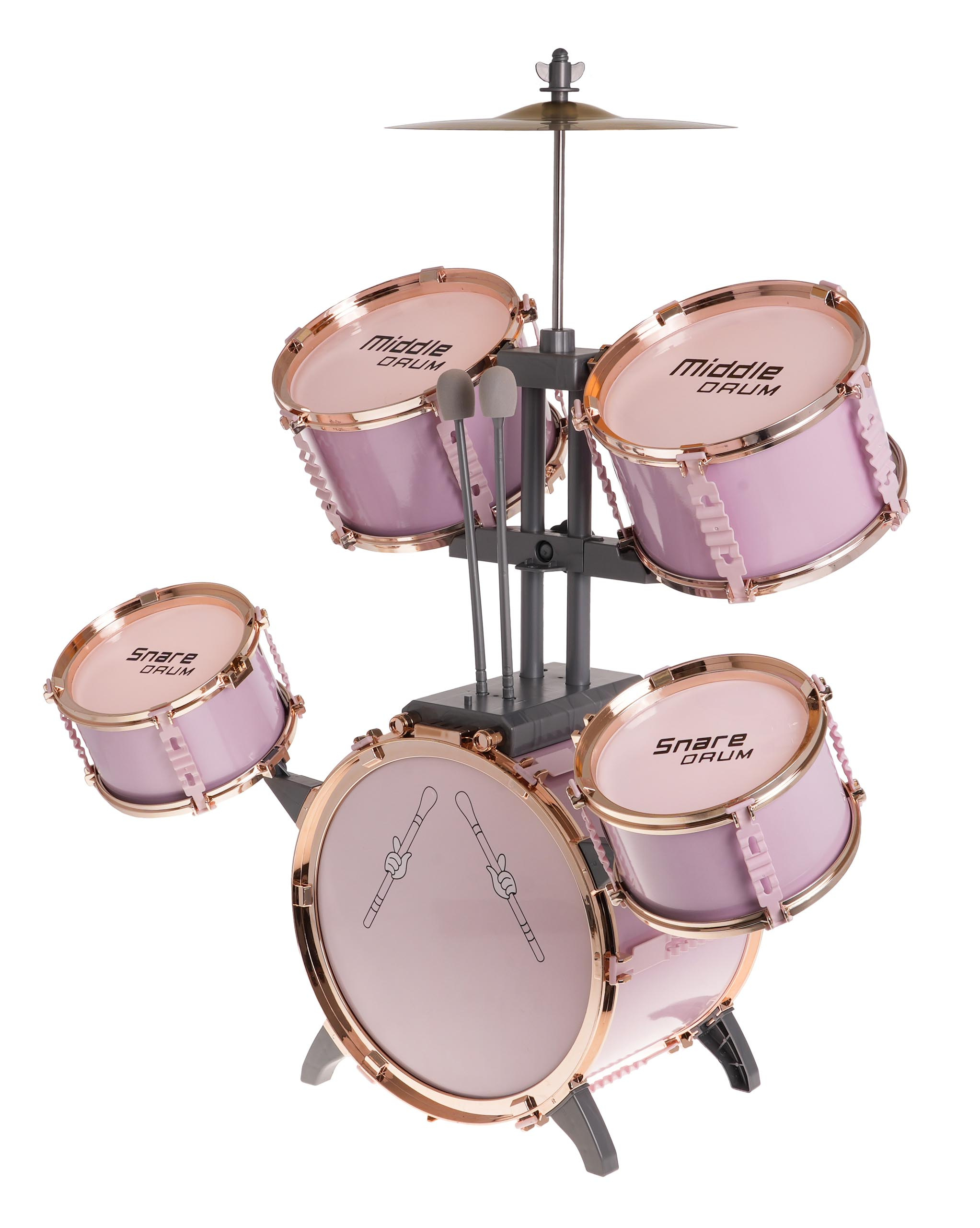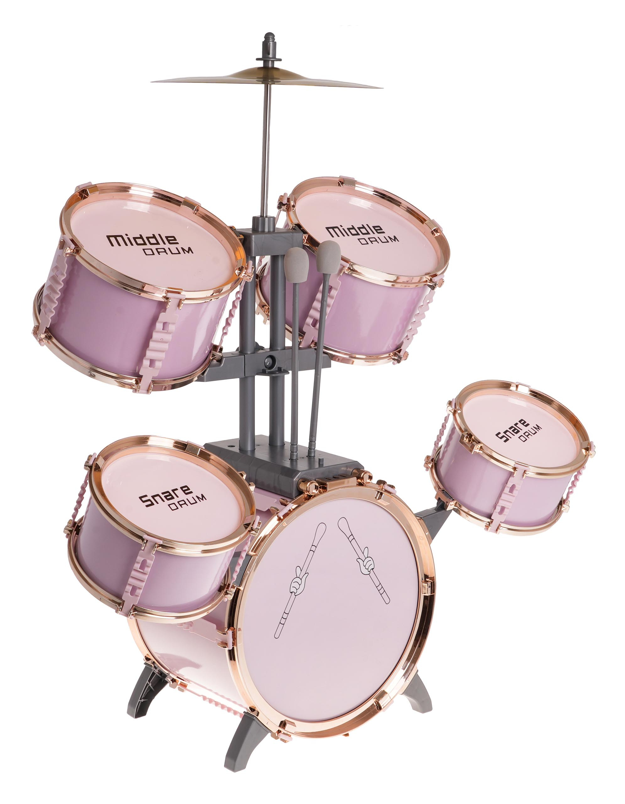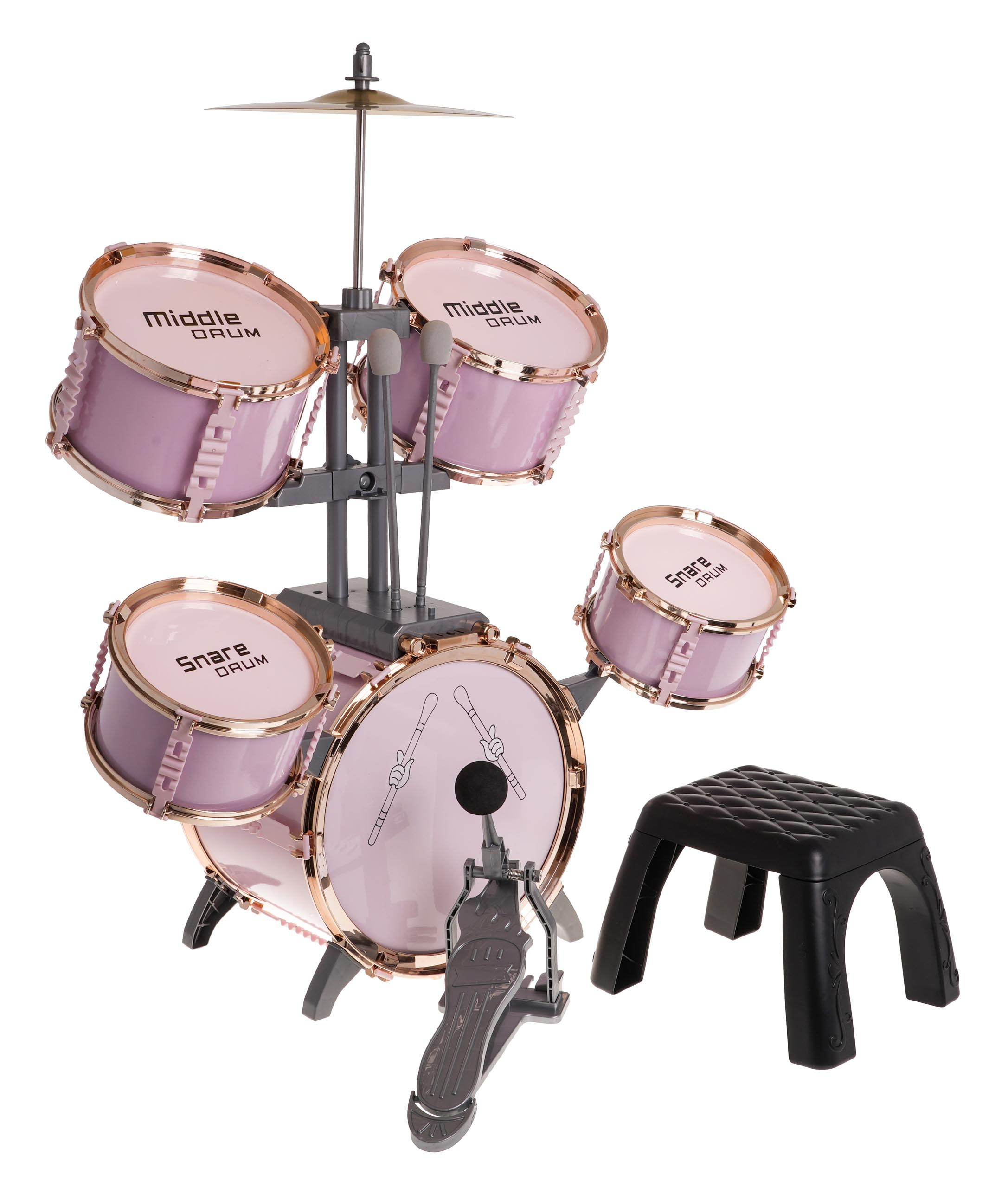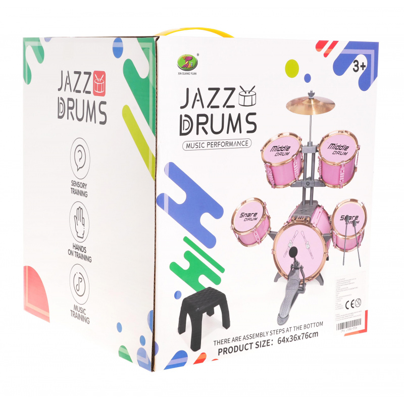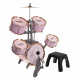 | Velká růžová bicí souprava se židličkou, která je součástí balení, je hrací nástroj pro děti od 3 let. Sada obsahuje 5 bubnů, kovový činel, 2 paličky a židli. | |