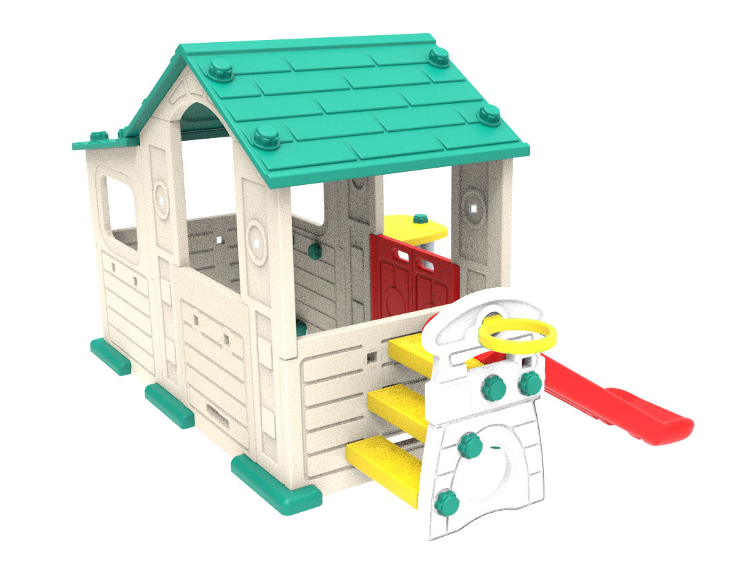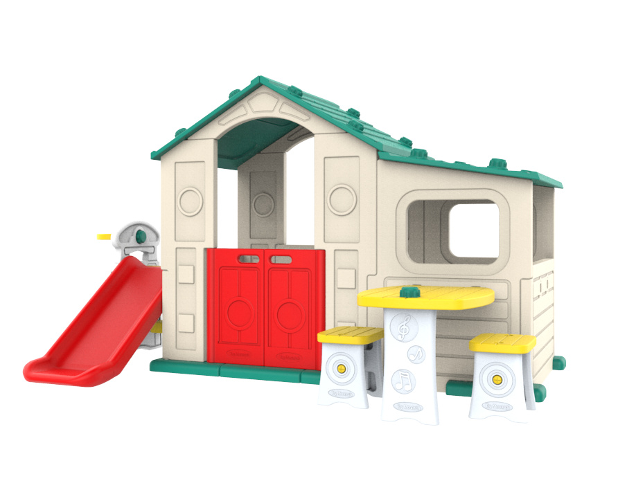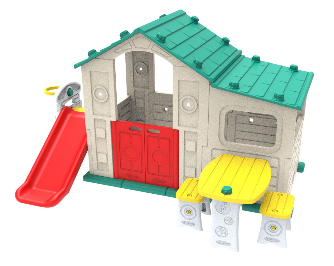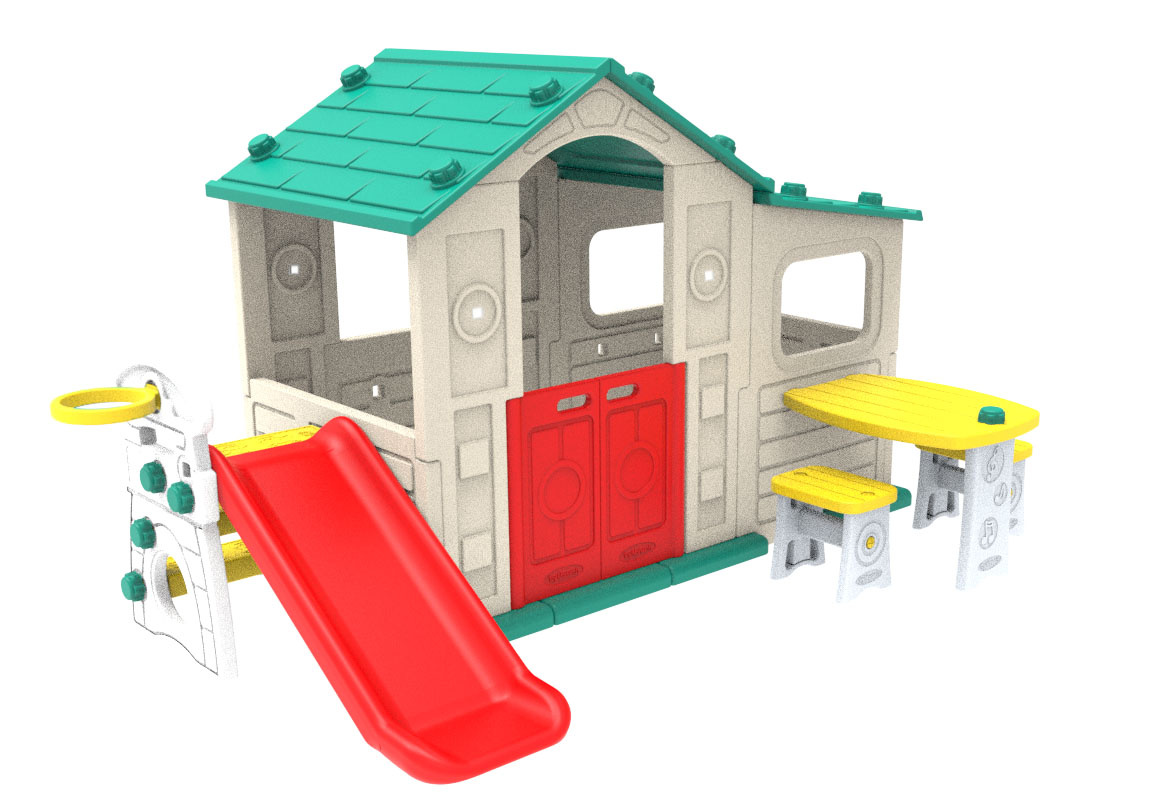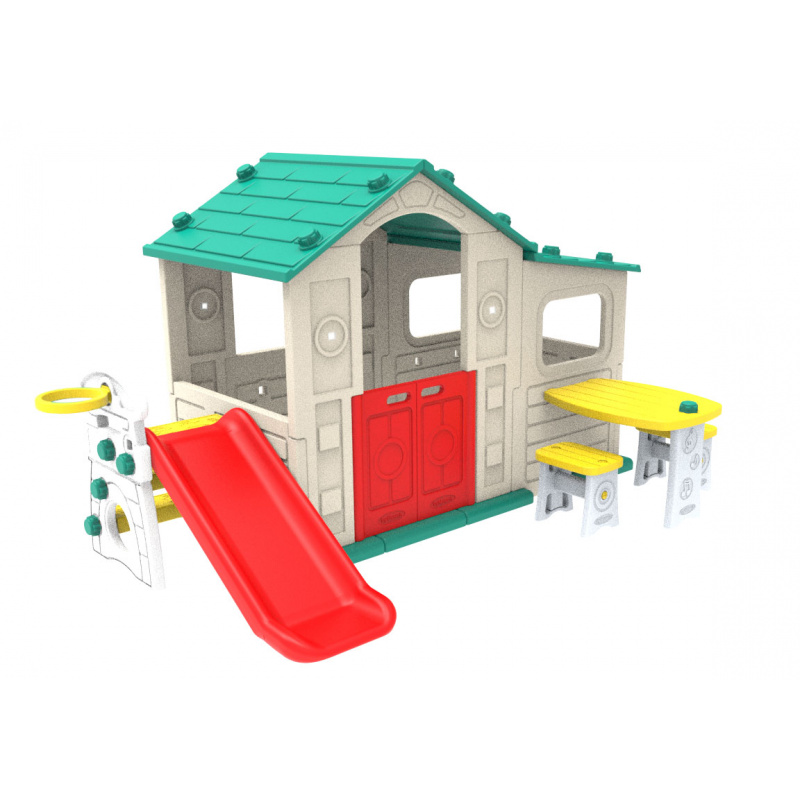 | Specifikace | Zahradní domek se skluzavkou, basketbalem a stolkem |