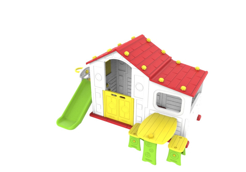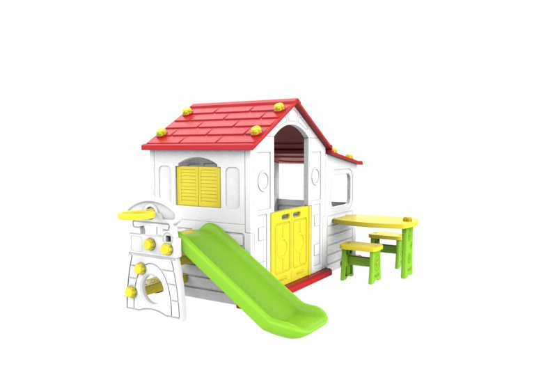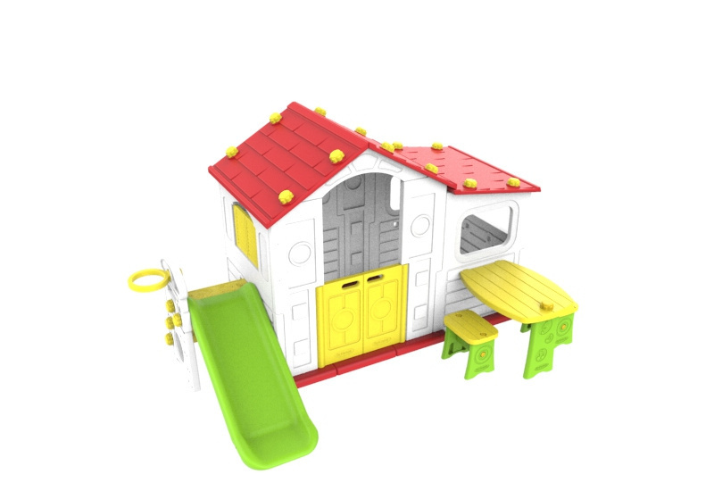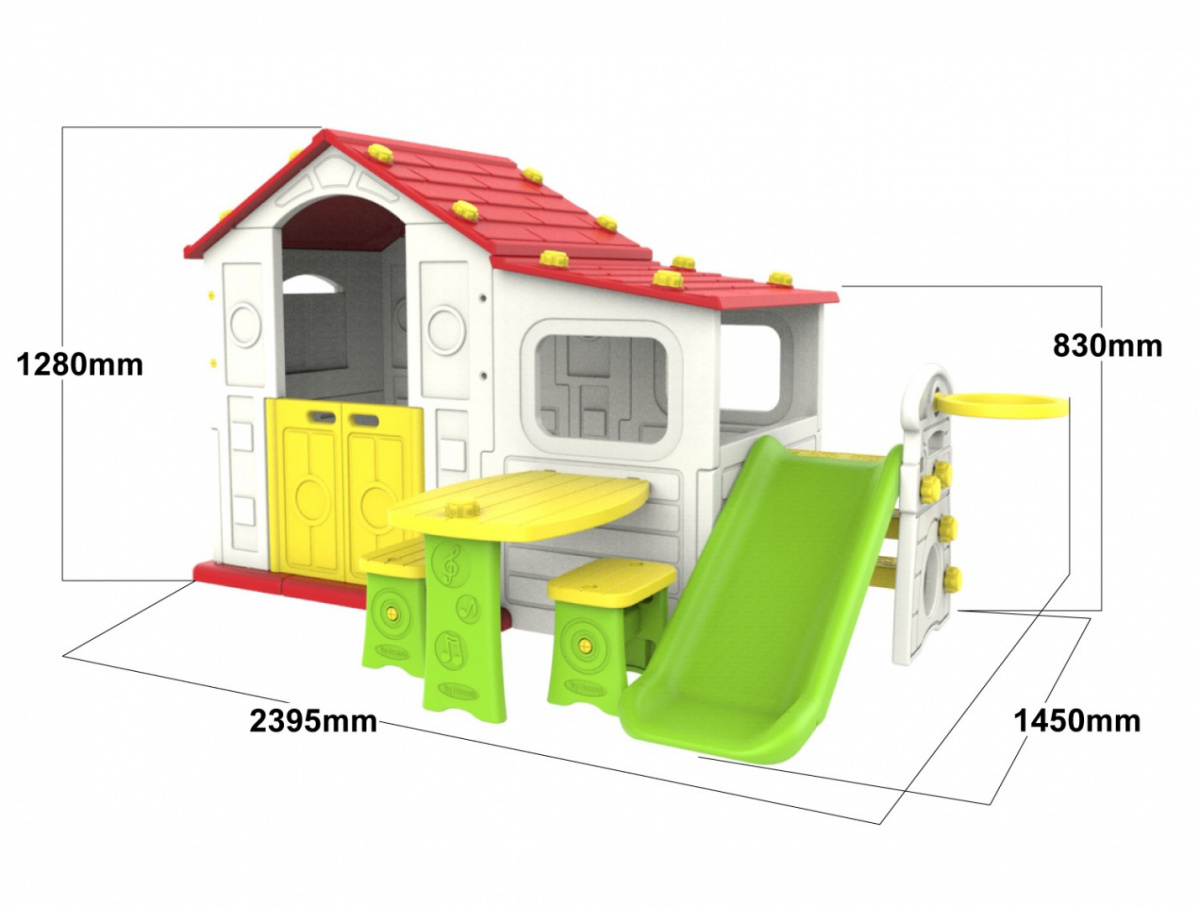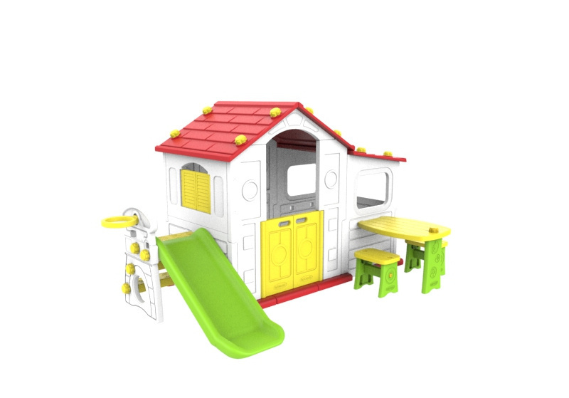 | Specifikace | Zahradní domek se skluzavkou, basketbalovým košem a stolem |