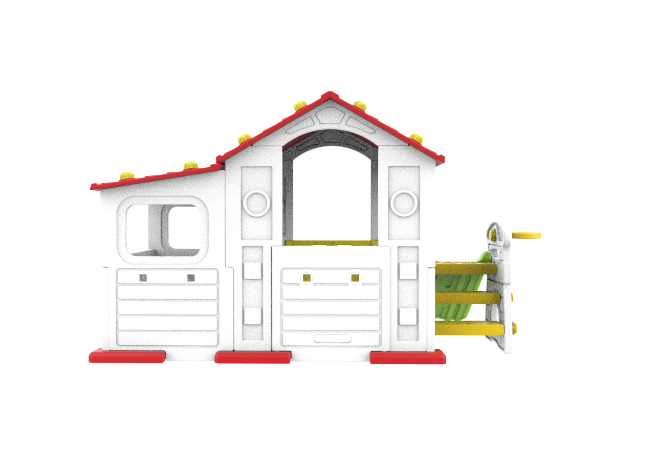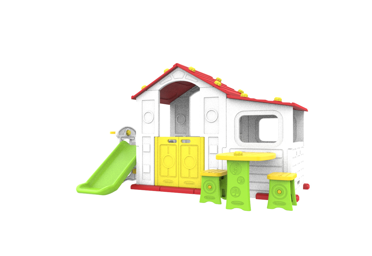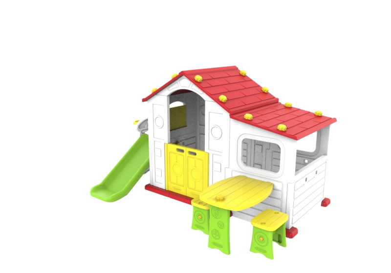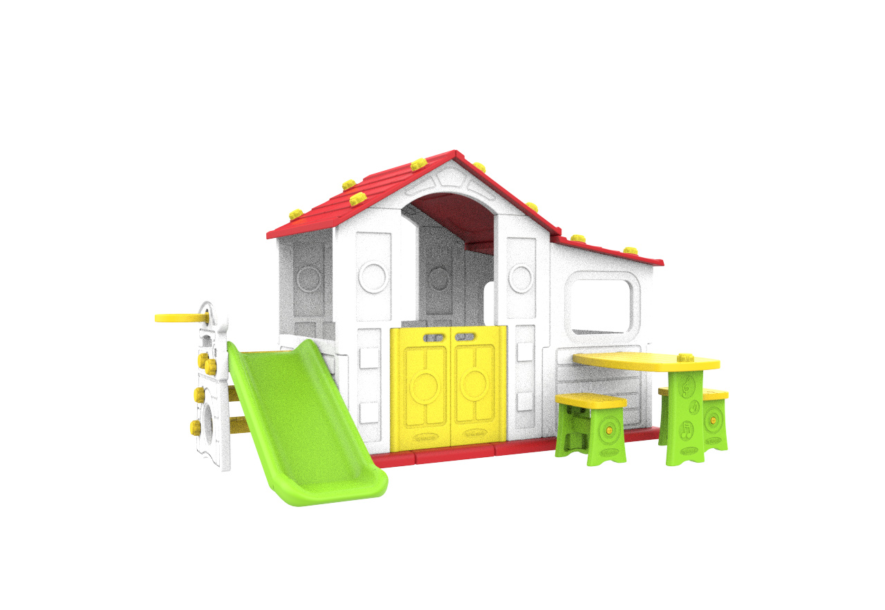 | Specifikace | Zahradní domek se skluzavkou, basketbalovým košem a stolem |
