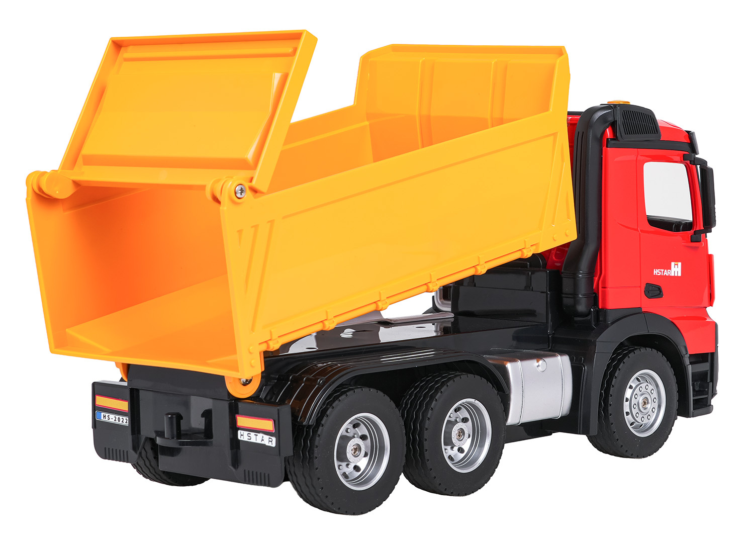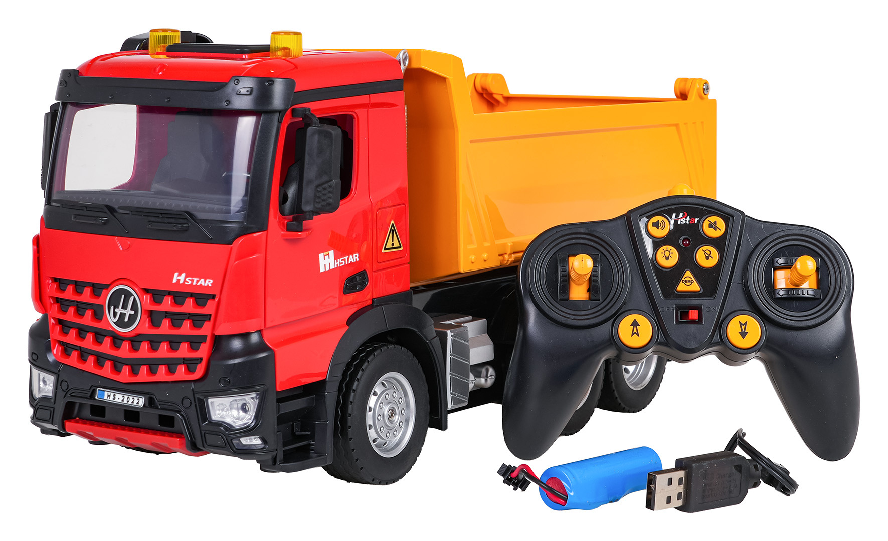 | Dálkově ovládaný sklápěč pro děti od šesti let. Vozidlo má gumové pneumatiky, které dobře drží na povrchu, na střeše nákladního auta a v jeho přední části svítí světla. Vozidlo je ovládáno dálkovým ovladačem, jezdí dopředu, dozadu, zatáčí doleva a doprava. Z ovladače můžeme také zapínat a vypínat osvětlení a zvuky, a také zvedat a spouštět přívěs. Hračka je napájena akumulátorem typu 3,7V (v balení), ovladač bateriemi typu 2 x AA 1,5V (nejsou v balení).