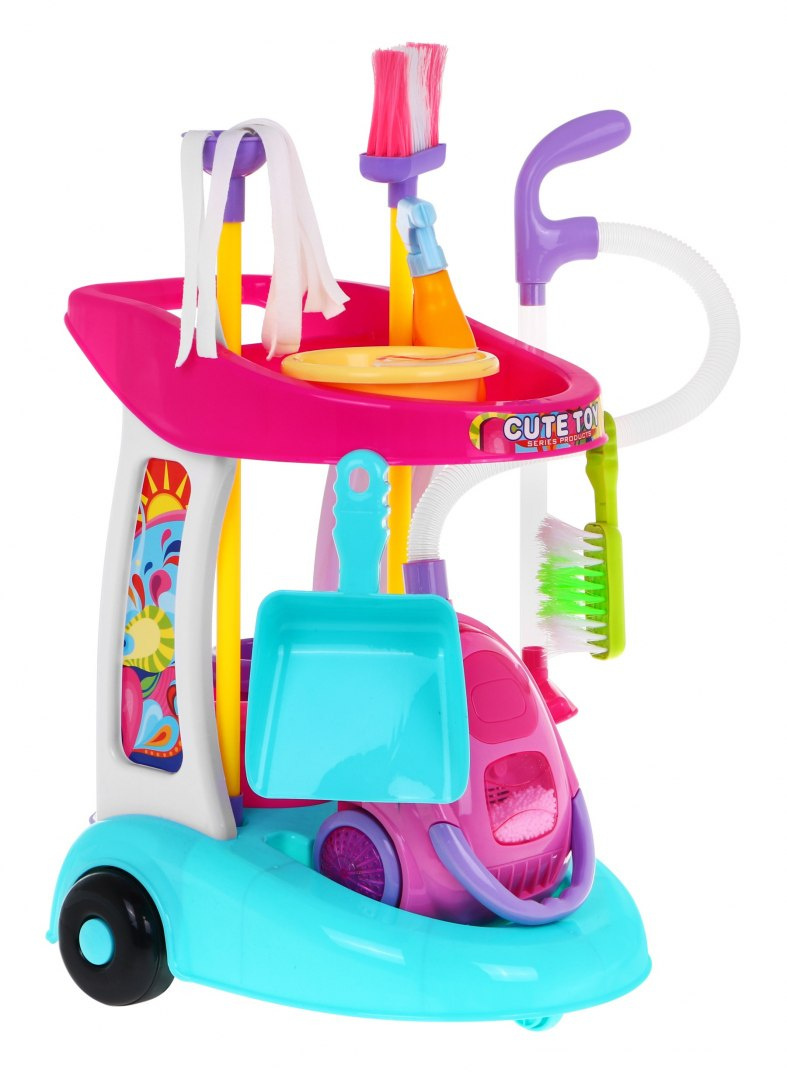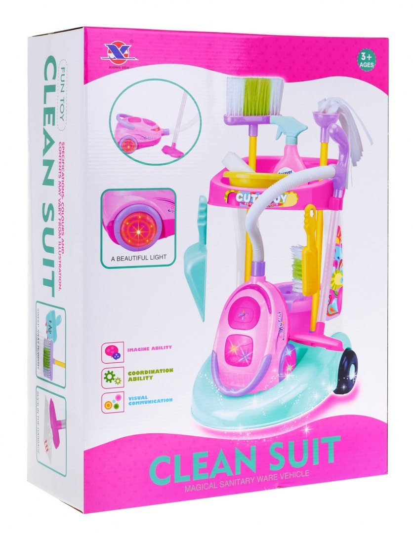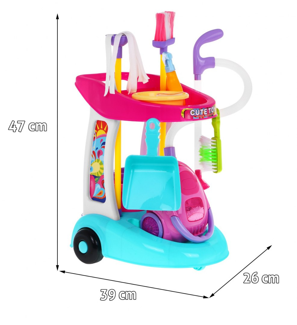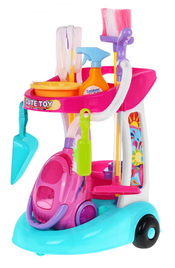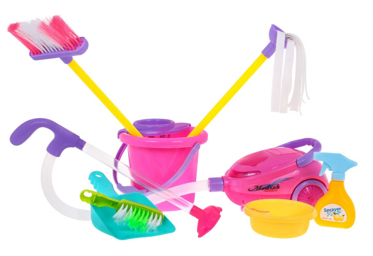 Úklidová sada pro malé hospodyňky je hračka určená pro děti od 3 let. Sada se skládá z vysavače, mopu a kbelíku, smetáku, lopatky, zametače, kartáče a mísy. Všechny čisticí prostředky lze naskládat na vozík, který je vybaven kolečky pro snadný pohyb. Vysavač je napájen 4 bateriemi AA (nejsou součástí dodávky). Umí opravdu vysávat, dokonale vtahuje polystyrenové kuličky (jsou součástí balení). Během vysávání se rozsvítí kolečka a světla na přední straně vysavače.